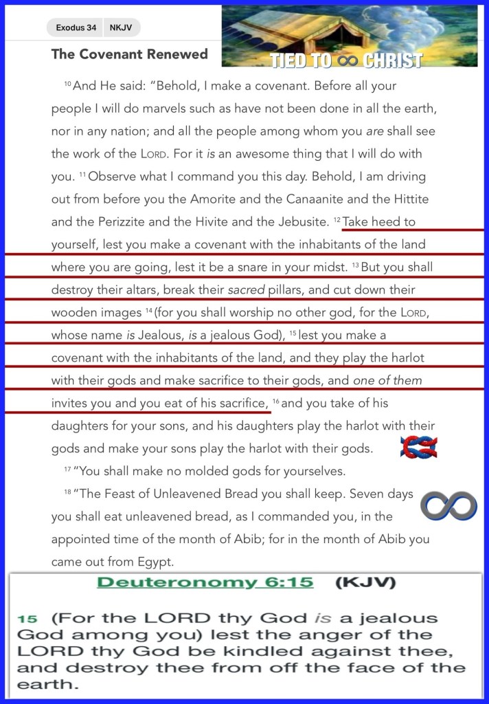 “Take heed to yourself, lest you make a covenant with the inhabitants of the land where you are going, lest it be a snare in your midst. But you shall destroy their altars, break their sacred pillars, and cut down their wooden images (for you shall worship no other god, for the Lord, whose name is Jealous, is a jealous God),” Exodus 34:12-14