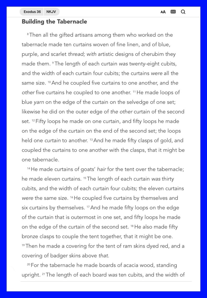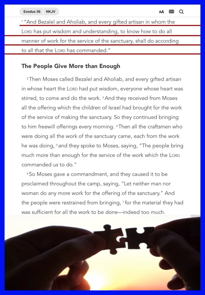 ““And Bezalel and Aholiab, and every gifted artisan in whom the Lord has put wisdom and understanding, to know how to do all manner of work for the service of the sanctuary, shall do according to all that the Lord has commanded.”” Exodus 36:1