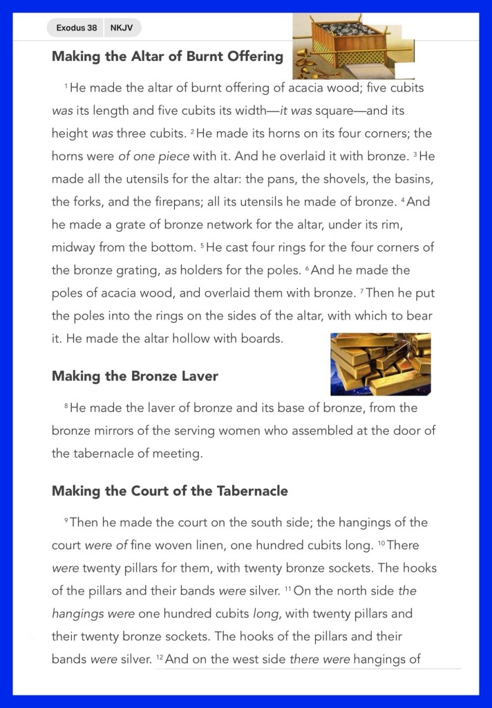 Today’s message Exodus 38, today’s verses: “So when Jesus had received the sour wine, He said, “It is finished!” And bowing His head, He gave up His Spirit” John 19:30 “Let us therefore come boldly to the throne of grace, that we may obtain mercy and find grace to help in time of need.” Hebrews 4:16