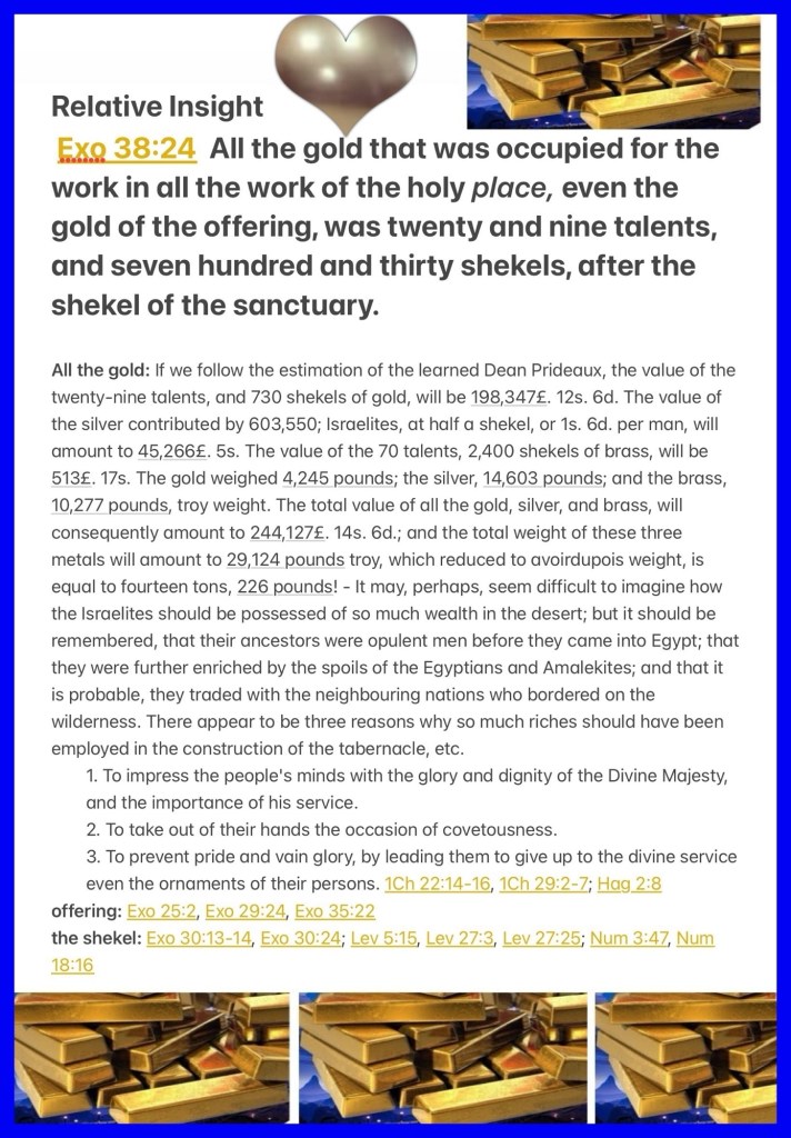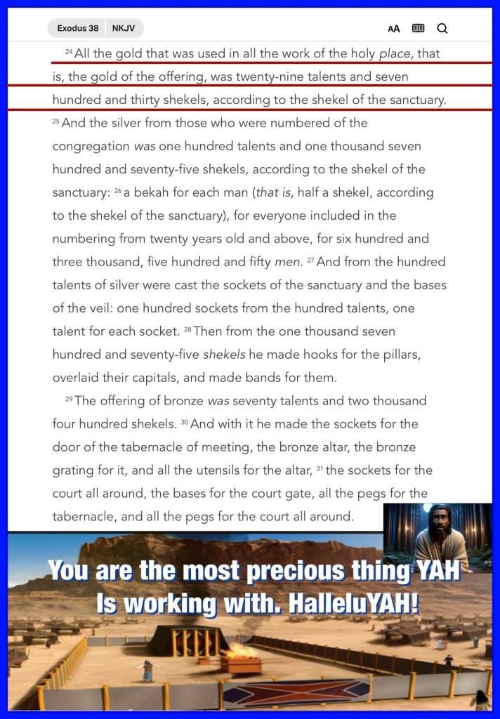 “All the gold that was used in all the work of the holy place, that is, the gold of the offering, was twenty-nine talents and seven hundred and thirty shekels, according to the shekel of the sanctuary.” Exodus 38:24