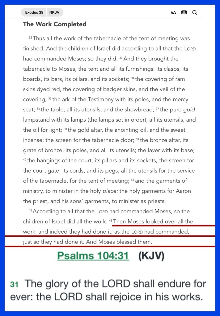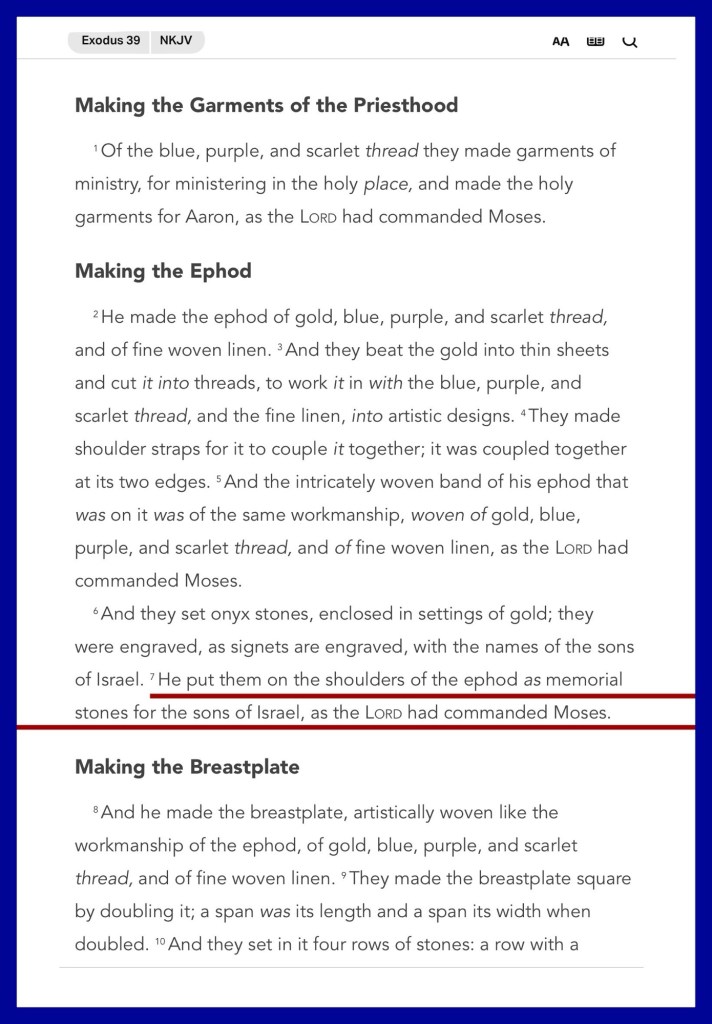 “He put them on the shoulders of the ephod as memorial stones for the sons of Israel, as the Lord had commanded Moses. …Then Moses looked over all the work, and indeed they had done it; as the Lord had commanded, just so they had done it. And Moses blessed them.” Exodus 39:7, 43