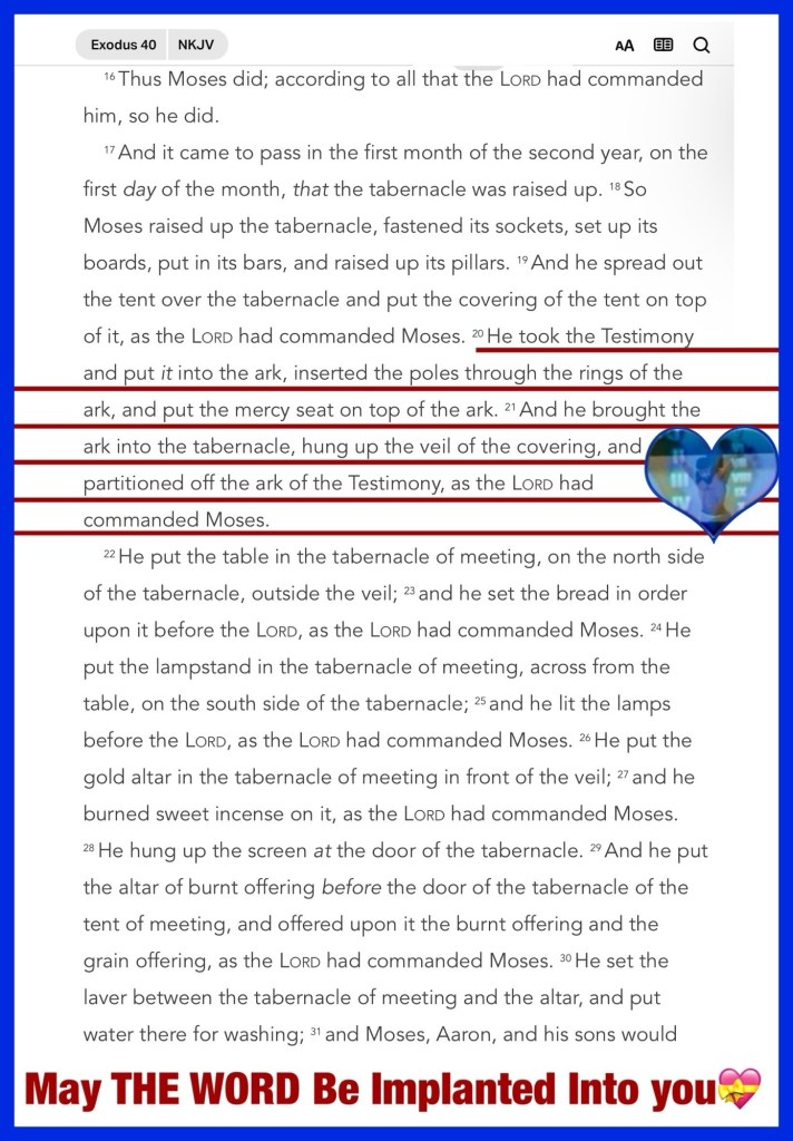“He took the Testimony and put it into the ark, inserted the poles through the rings of the ark, and put the mercy seat on top of the ark. And he brought the ark into the tabernacle, hung up the veil of the covering, and partitioned off the ark of the Testimony, as the Lord had commanded Moses.” Exodus 40:20-21