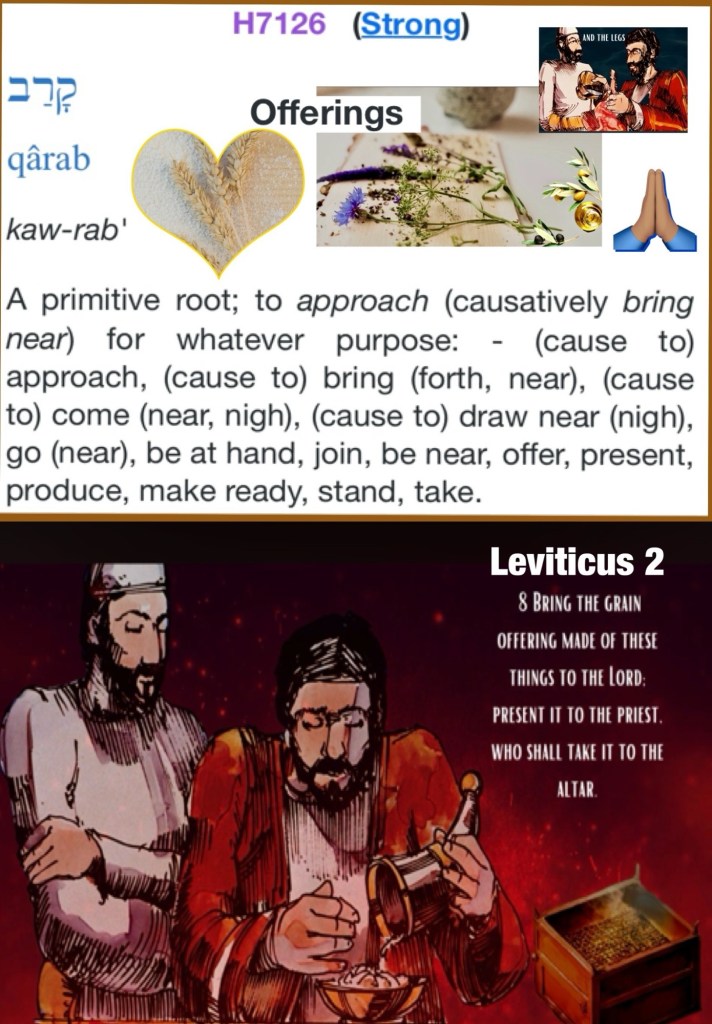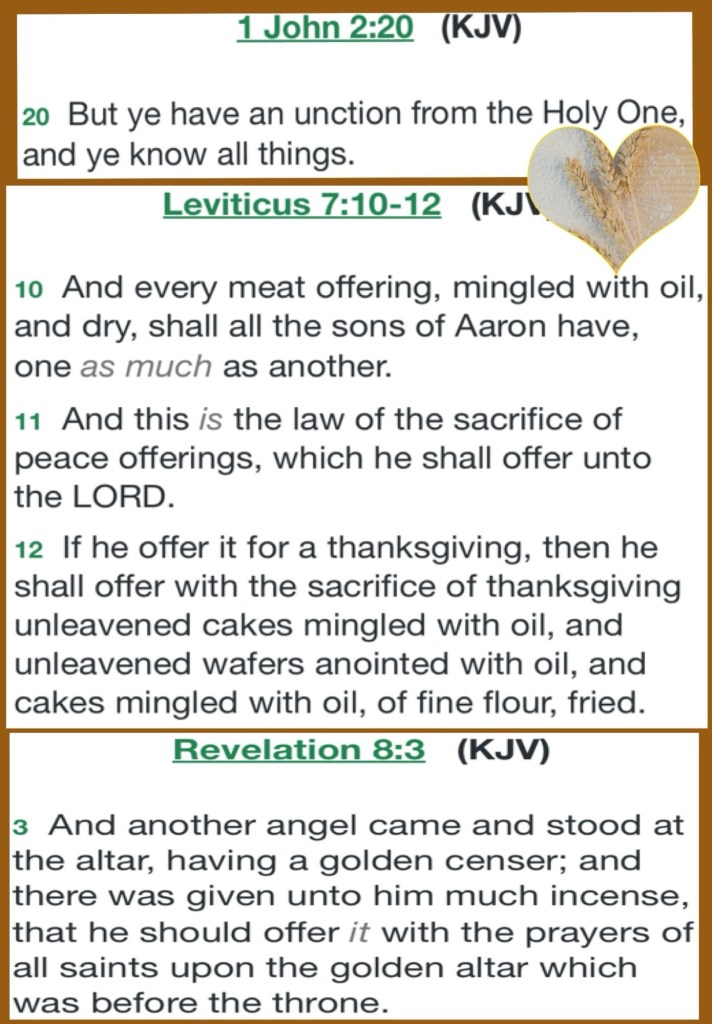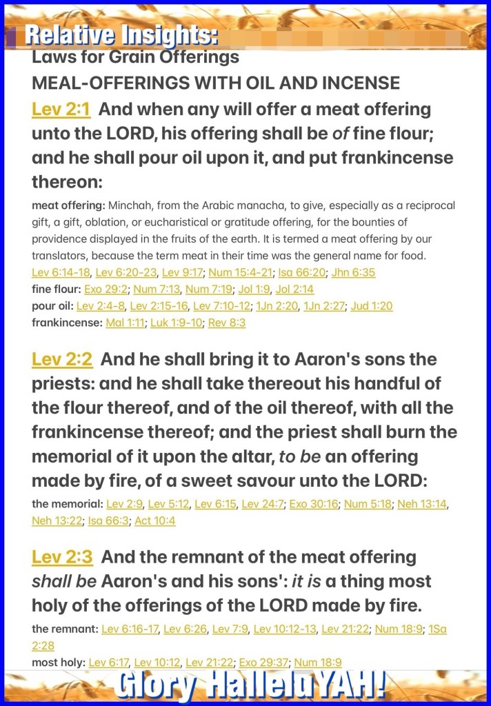 “‘And when anyone brings a grain offering to יהוה, his offering is to be of fine flour. And he shall pour oil on it, and put frankincense on it, and he shall bring it to the sons of Aharon, the priests, and he shall take from it his hand filled with fine flour and oil with all the frankincense. And the priest shall burn it as a remembrance portion on the slaughter-place, an offering made by fire, a sweet fragrance to יהוה. ‘And the rest of the grain offering is for Aharon and his sons, most set-apart of the offerings to יהוה by fire.” Wayyiqra (Leviticus) 2:1-3 TS2009