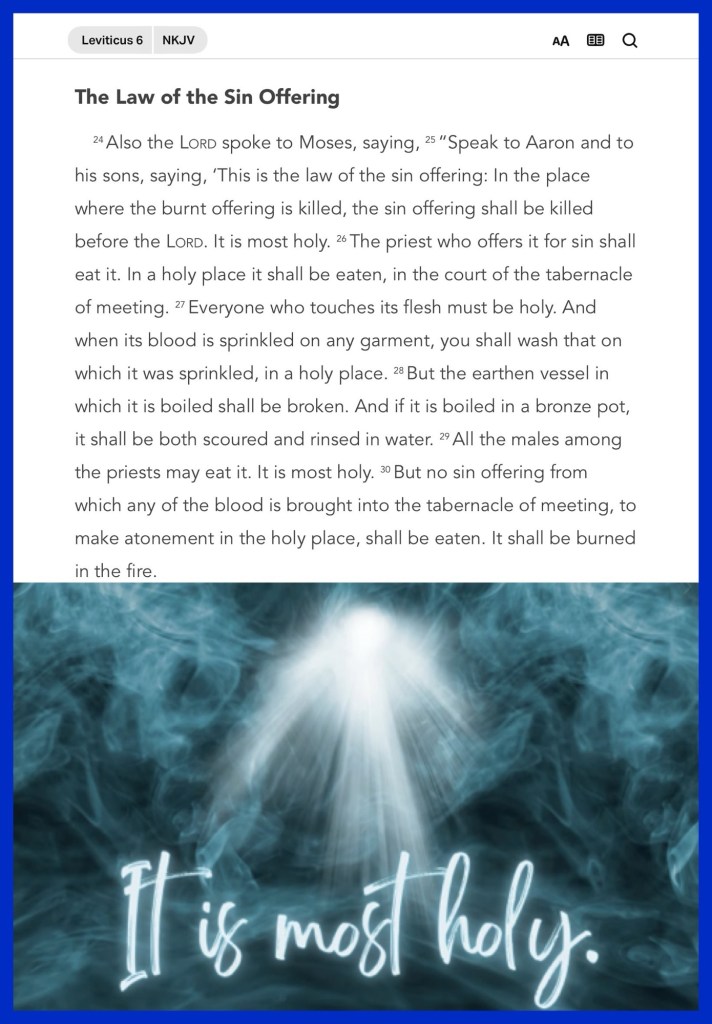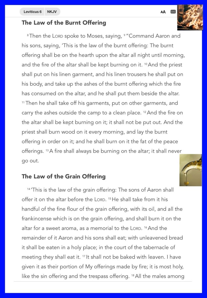 Today’s message Leviticus 6, today’s verses: “And God said to Moses, “I AM WHO I AM.” And He said, “Thus you shall say to the children of Israel, ‘I AM has sent me to you.’ ” Moreover God said to Moses, “Thus you shall say to the children of Israel: ‘The Lord God of your fathers, the God of Abraham, the God of Isaac, and the God of Jacob, has sent me to you. This is My name forever, and this is My memorial to all generations.’” Exodus 3:14-15 “And take the helmet of salvation, and the sword of the Spirit, which is the word of God;” Ephesians 6:17