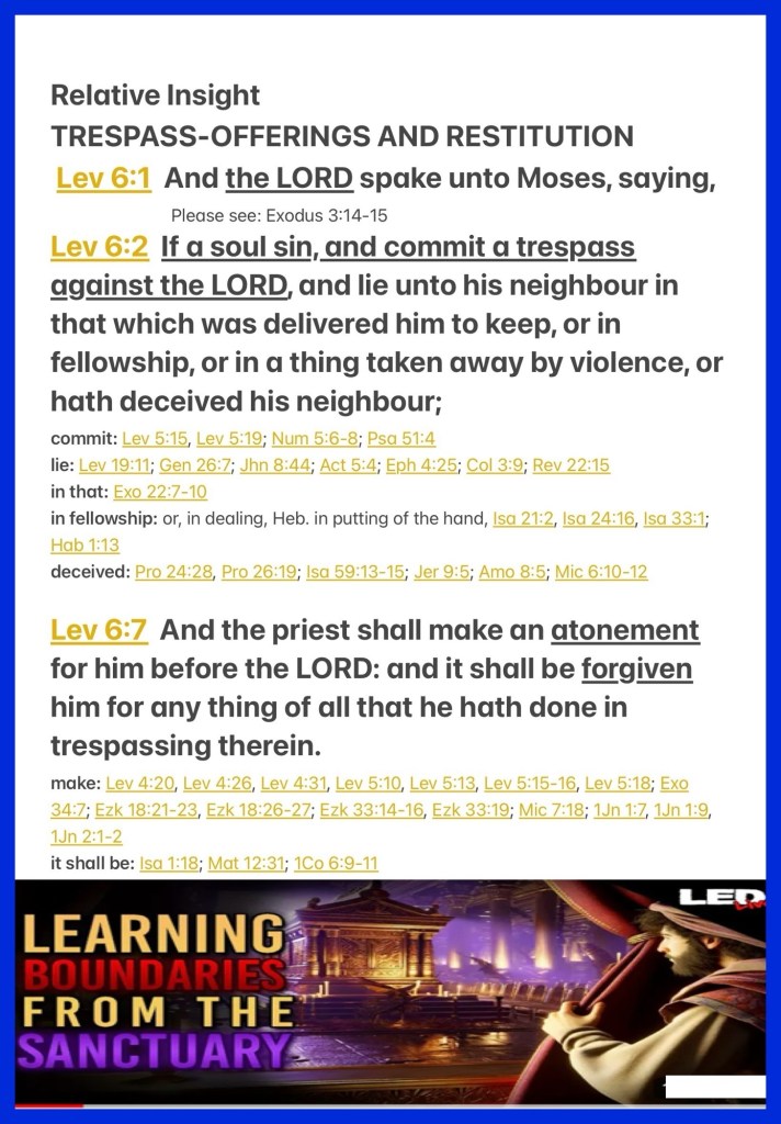 “And the Lord spoke to Moses, saying: “If a person sins and commits a trespass against the Lord by lying to his neighbor about what was delivered to him for safekeeping, or about a pledge, or about a robbery, or if he has extorted from his neighbor, …So the priest shall make atonement for him before the Lord, and he shall be forgiven for any one of these things that he may have done in which he trespasses.”” Leviticus 6:1-2, 7
