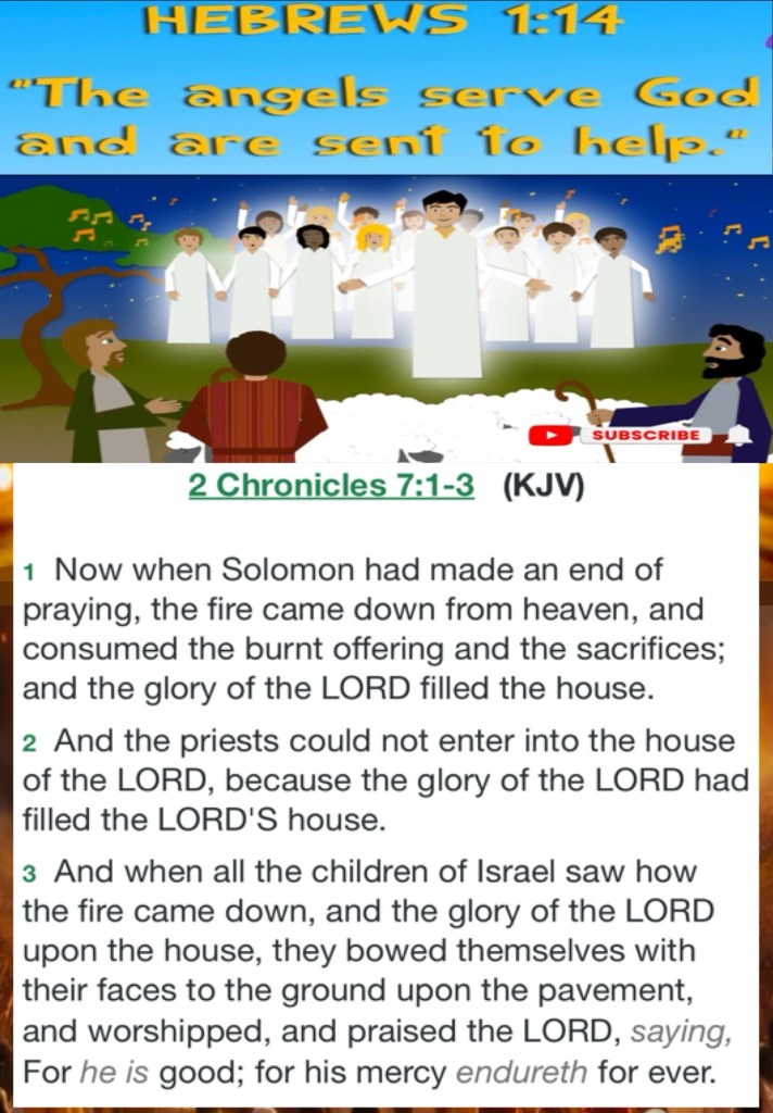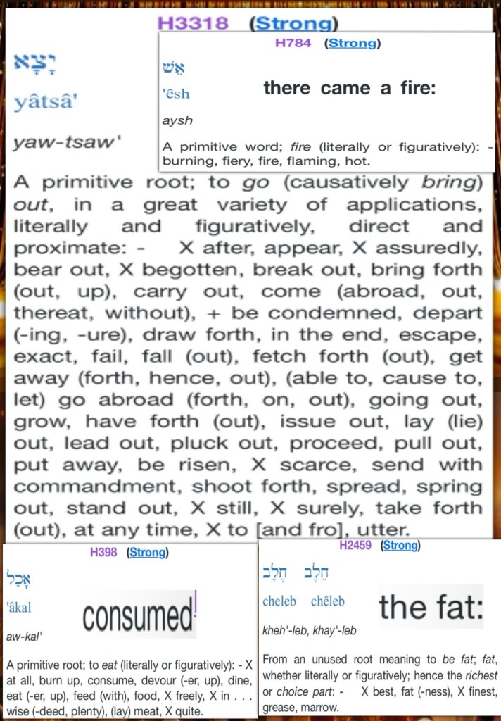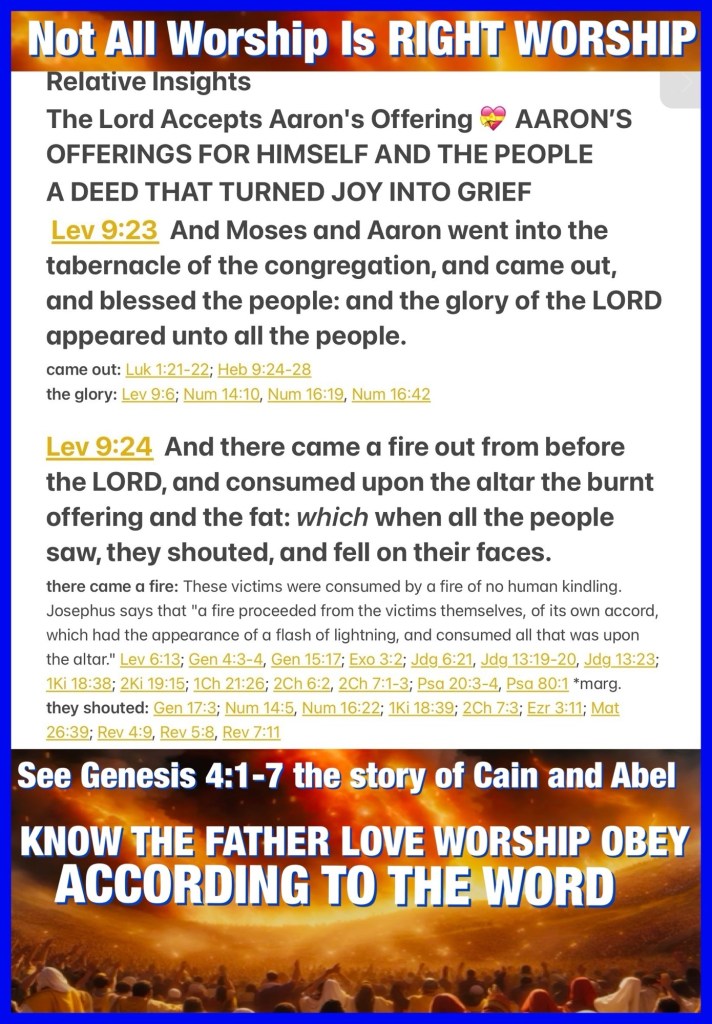 “And Moses and Aaron went into the tabernacle of meeting, and came out and blessed the people. Then the glory of the Lord appeared to all the people, and fire came out from before the Lord and consumed the burnt offering and the fat on the altar. When all the people saw it, they shouted and fell on their faces.” Leviticus 9:23-24