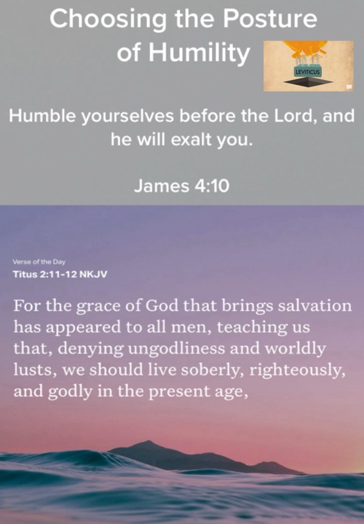 Today’s message Leviticus 10, today’s verses: “Humble yourselves in the sight of the Lord, and He will lift you up.” James 4:10 “For the grace of God that brings salvation has appeared to all men, teaching us that, denying ungodliness and worldly lusts, we should live soberly, righteously, and godly in the present age,” Titus 2:11-12