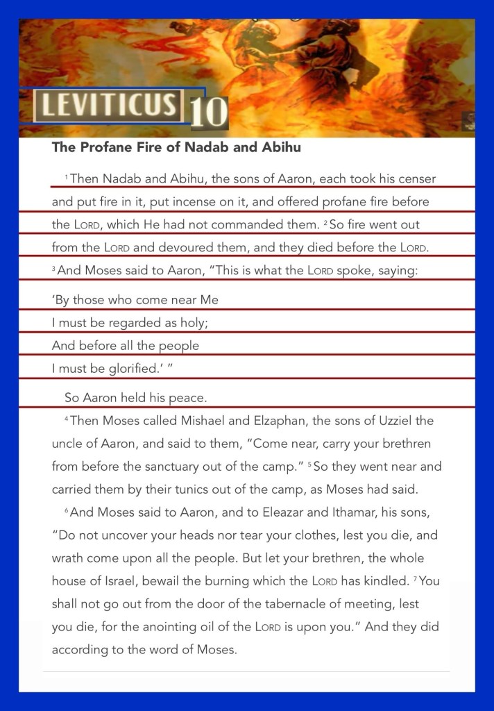 “Then Nadab and Abihu, the sons of Aaron, each took his censer and put fire in it, put incense on it, and offered profane fire before the Lord, which He had not commanded them. So fire went out from the Lord and devoured them, and they died before the Lord. And Moses said to Aaron, “This is what the Lord spoke, saying: ‘By those who come near Me I must be regarded as holy; And before all the people I must be glorified.’ ” So Aaron held his peace.” Leviticus 10:1-3