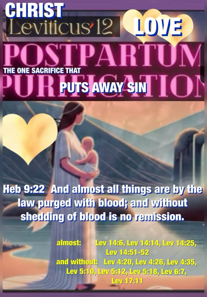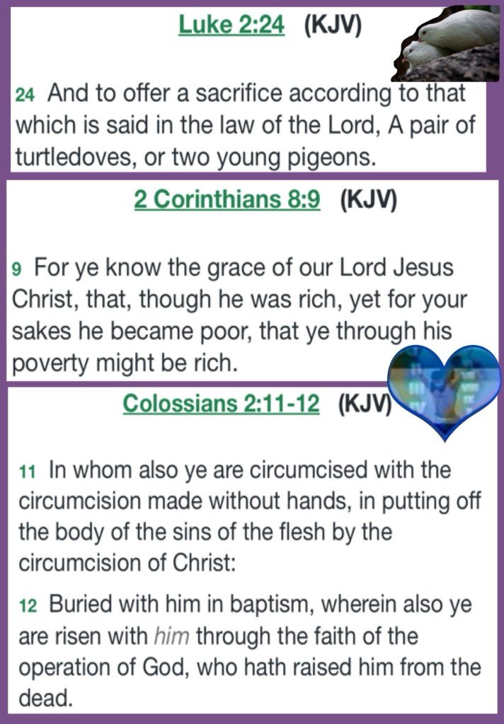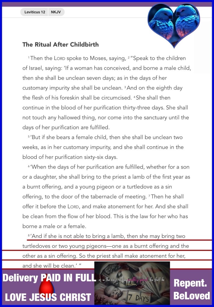 “‘And if she is not able to bring a lamb, then she may bring two turtledoves or two young pigeons—one as a burnt offering and the other as a sin offering. So the priest shall make atonement for her, and she will be clean.’ ”” Leviticus 12:8
