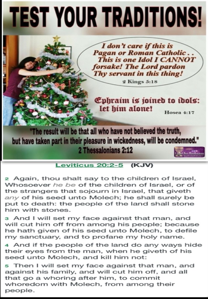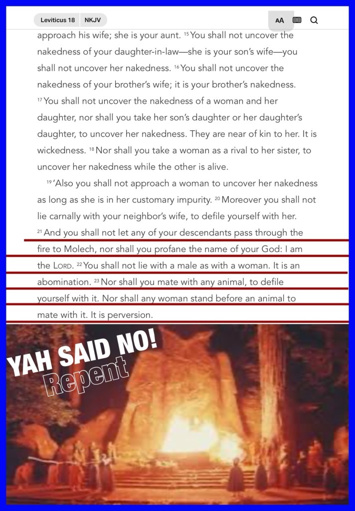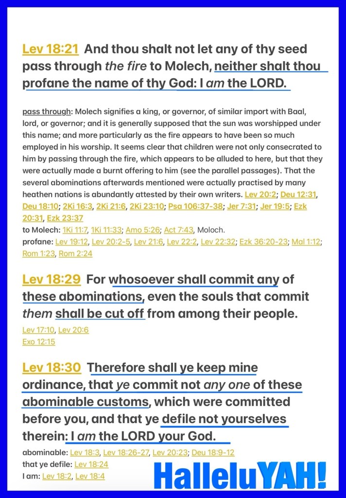 “And you shall not let any of your descendants pass through the fire to Molech, nor shall you profane the name of your God: I am the Lord. …For whoever commits any of these abominations, the persons who commit them shall be cut off from among their people. ‘Therefore you shall keep My ordinance, so that you do not commit any of these abominable customs which were committed before you, and that you do not defile yourselves by them: I am the Lord your God.’ ”” Leviticus 18:21, 29-30