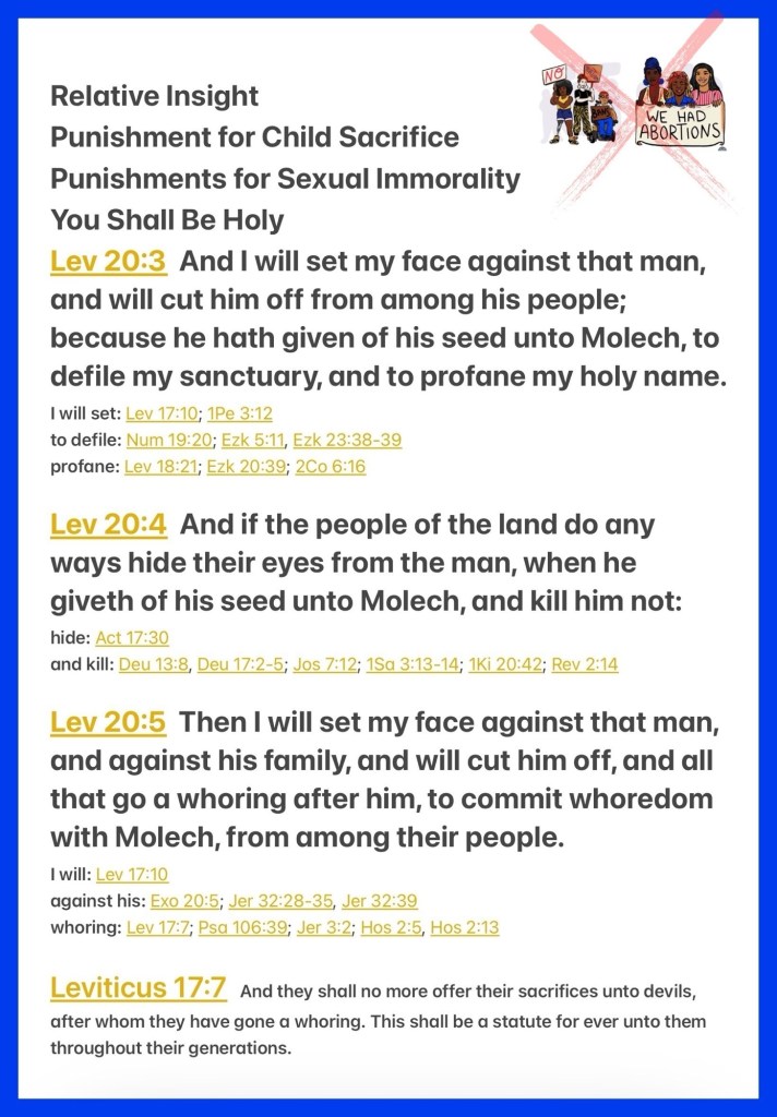 “I will set My face against that man, and will cut him off from his people, because he has given some of his descendants to Molech, to defile My sanctuary and profane My holy name. And if the people of the land should in any way hide their eyes from the man, when he gives some of his descendants to Molech, and they do not kill him, then I will set My face against that man and against his family; and I will cut him off from his people, and all who prostitute themselves with him to commit harlotry with Molech.” Leviticus 20:3-5