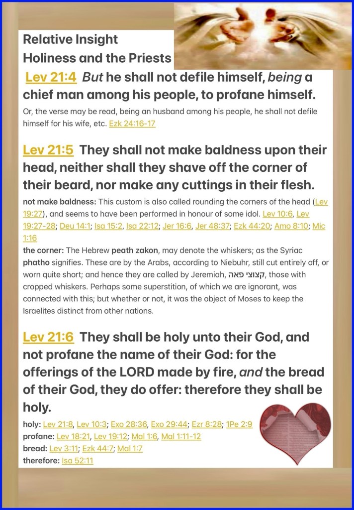 “Otherwise he shall not defile himself, being a chief man among his people, to profane himself. ‘They shall not make any bald place on their heads, nor shall they shave the edges of their beards nor make any cuttings in their flesh. They shall be holy to their God and not profane the name of their God, for they offer the offerings of the Lord made by fire, and the bread of their God; therefore they shall be holy.” Leviticus 21:4-6
