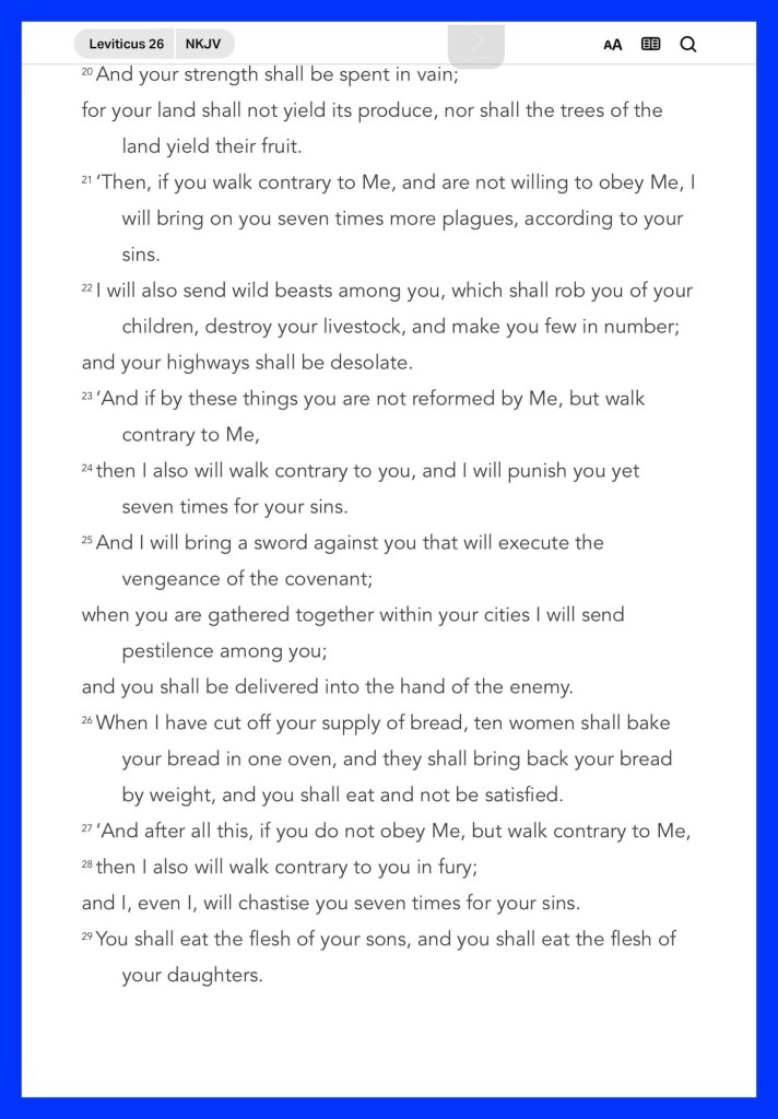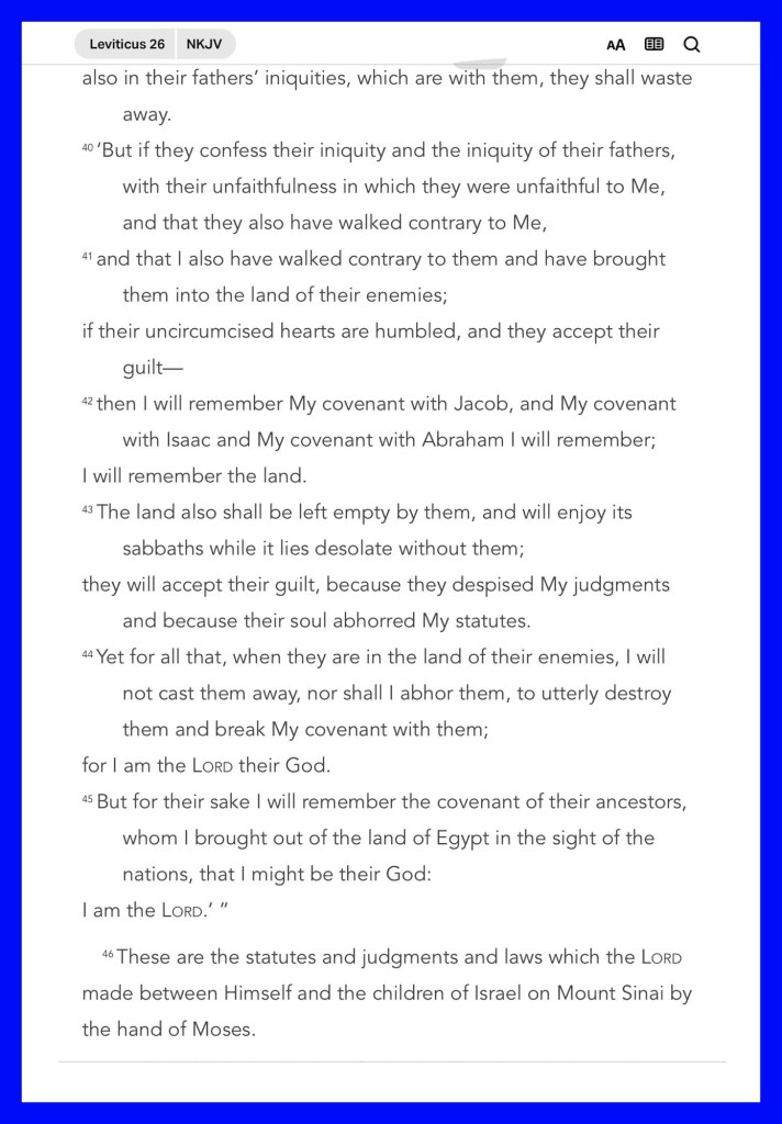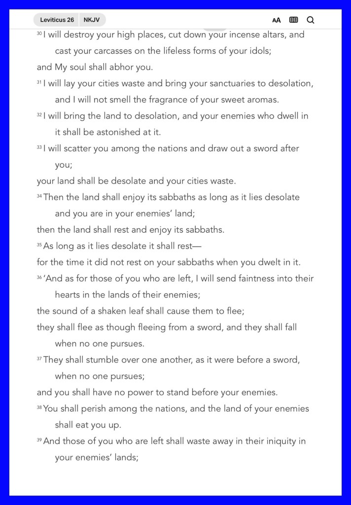 Today’s message Leviticus 26, today’s verses: “So then, my beloved brethren, let every man be swift to hear, slow to speak, slow to wrath; for the wrath of man does not produce the righteousness of God.” James 1:19-20 “Trust in the Lord with all your heart, And lean not on your own understanding; In all your ways acknowledge Him, And He shall direct your paths.” Proverbs 3:5-6