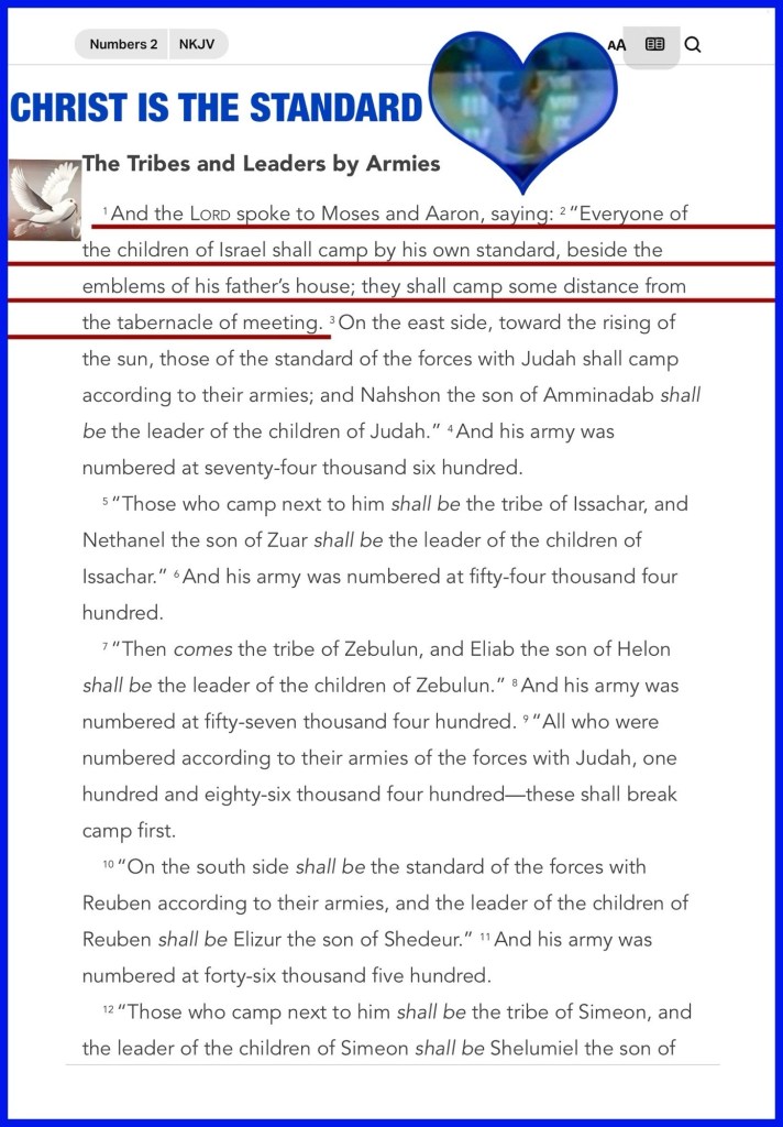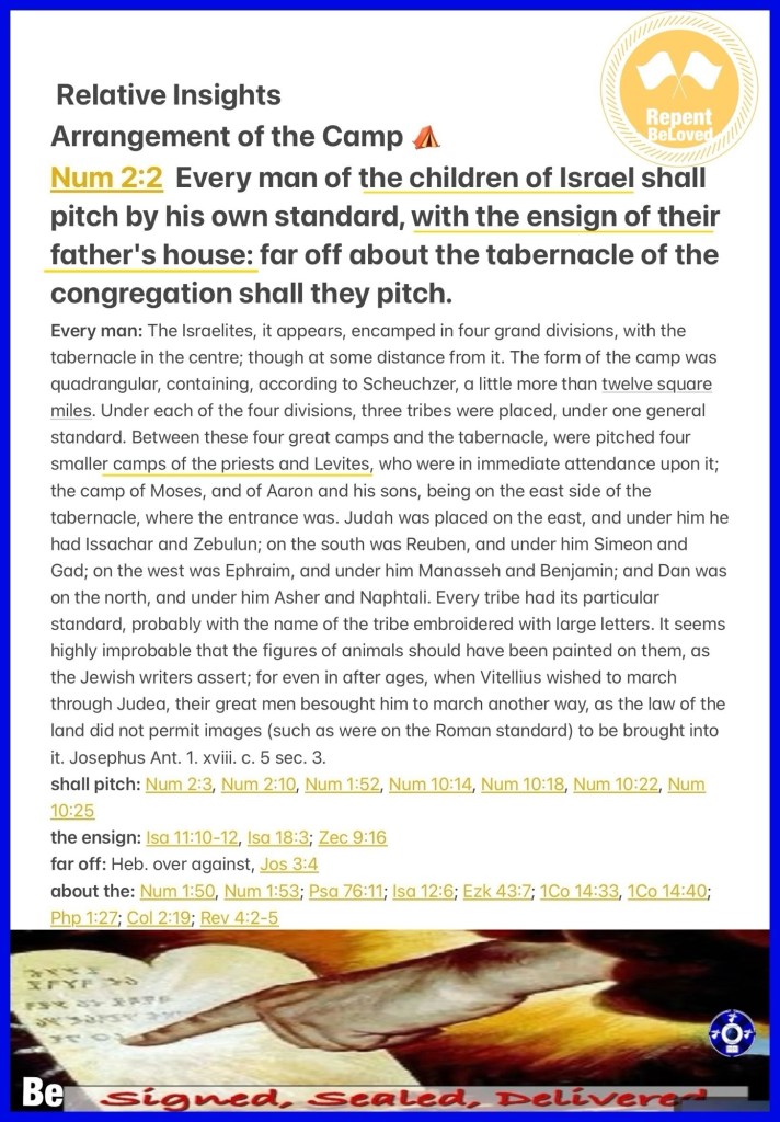“And the Lord spoke to Moses and Aaron, saying: “Everyone of the children of Israel shall camp by his own standard, beside the emblems of his father’s house; they shall camp some distance from the tabernacle of meeting.” Numbers 2:1-2