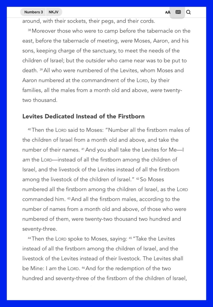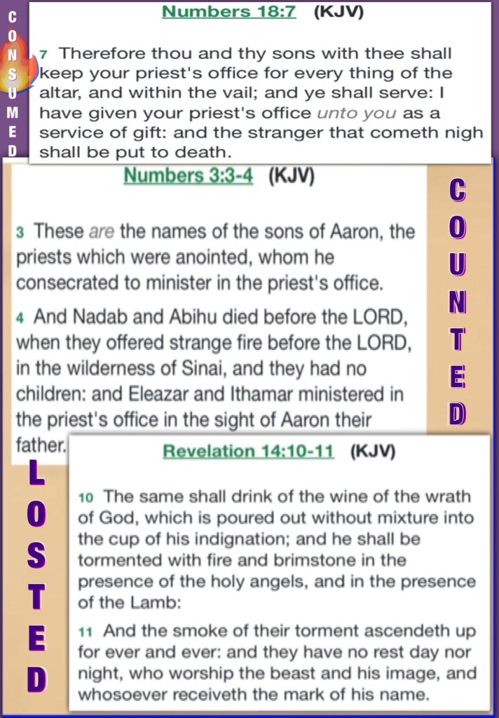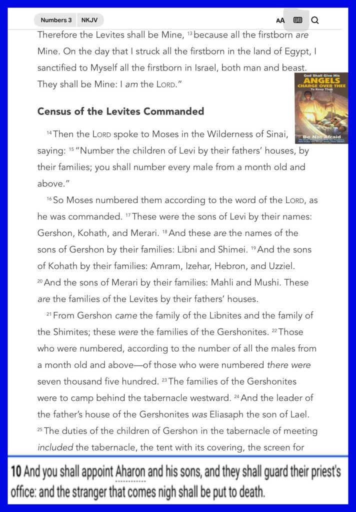 “Nadab and Abihu had died before the Lord when they offered profane fire before the Lord in the Wilderness of Sinai; and they had no children. So Eleazar and Ithamar ministered as priests in the presence of Aaron their father. So you shall appoint Aaron and his sons, and they shall attend to their priesthood; but the outsider who comes near shall be put to death.”” Numbers 3:4, 10