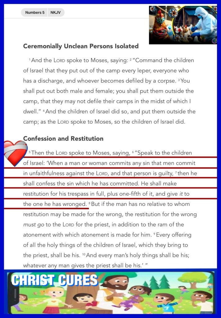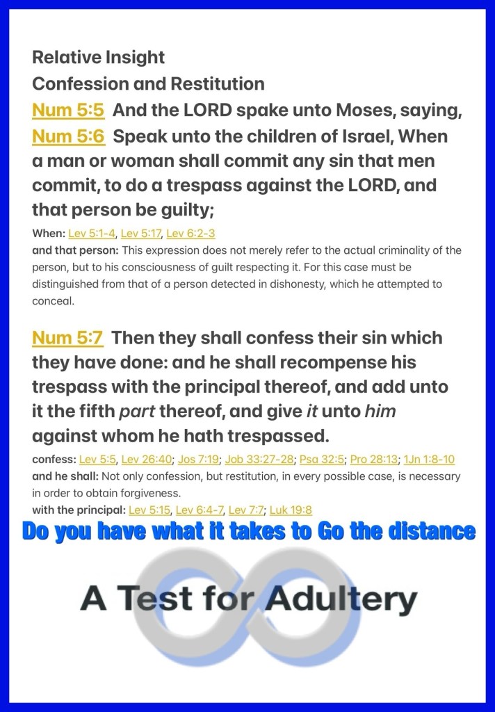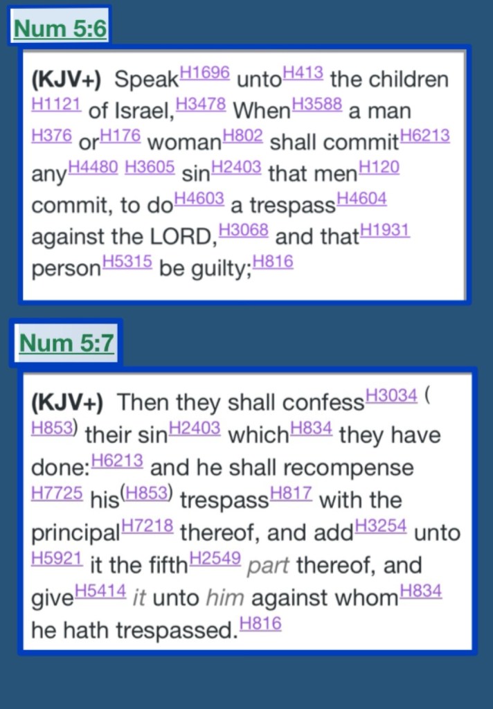 “Then the Lord spoke to Moses, saying, “Speak to the children of Israel: ‘When a man or woman commits any sin that men commit in unfaithfulness against the Lord, and that person is guilty, then he shall confess the sin which he has committed. He shall make restitution for his trespass in full, plus one-fifth of it, and give it to the one he has wronged.” Numbers 5:5-7