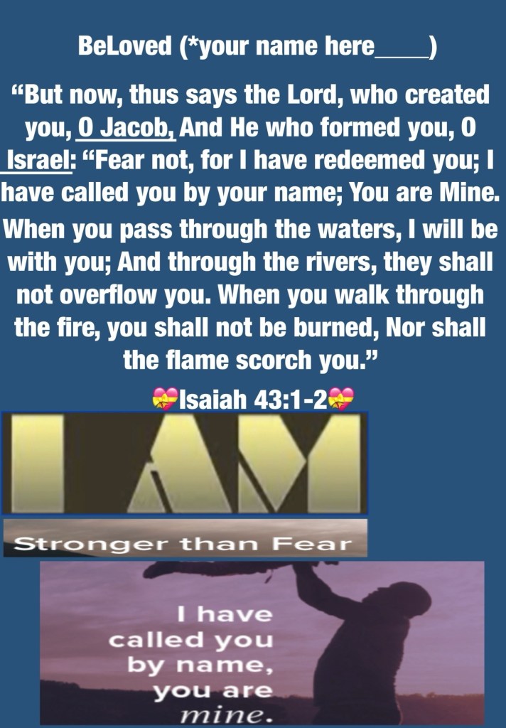 Today’s message Numbers 7, today’s verses: “But now, thus says the Lord, who created you, O Jacob, And He who formed you, O Israel: “Fear not, for I have redeemed you; I have called you by your name; You are Mine. When you pass through the waters, I will be with you; And through the rivers, they shall not overflow you. When you walk through the fire, you shall not be burned, Nor shall the flame scorch you.” Isaiah 43:1-2 “If I say, “Surely the darkness shall fall on me,” Even the night shall be light about me; Indeed, the darkness shall not hide from You, But the night shines as the day; The darkness and the light are both alike to You.” Psalms 139:11-12