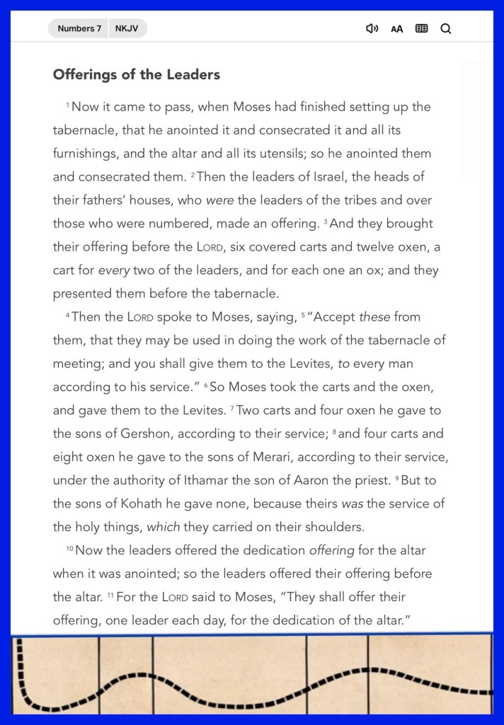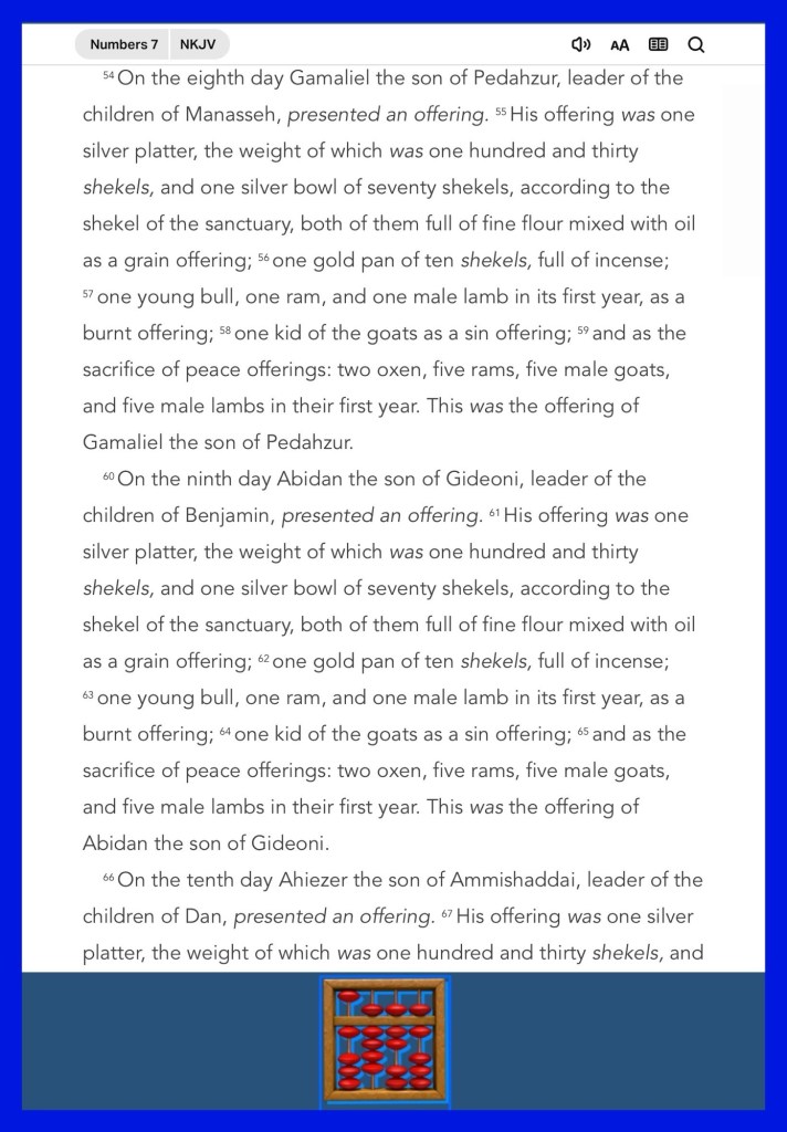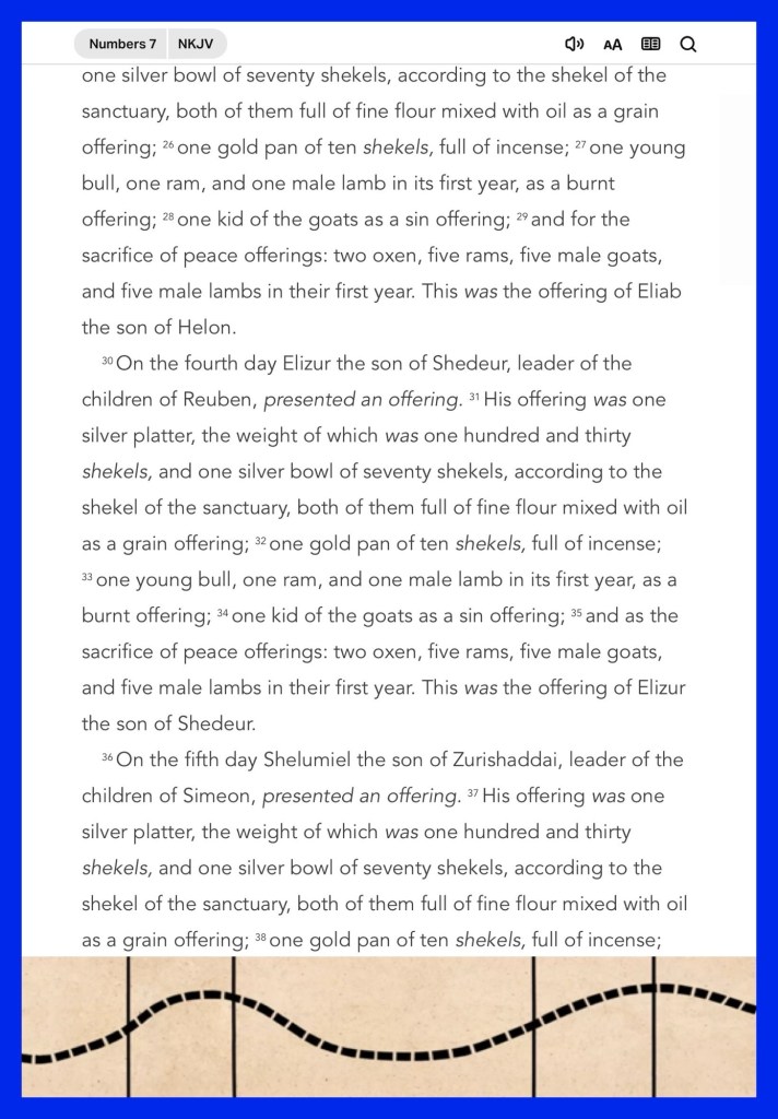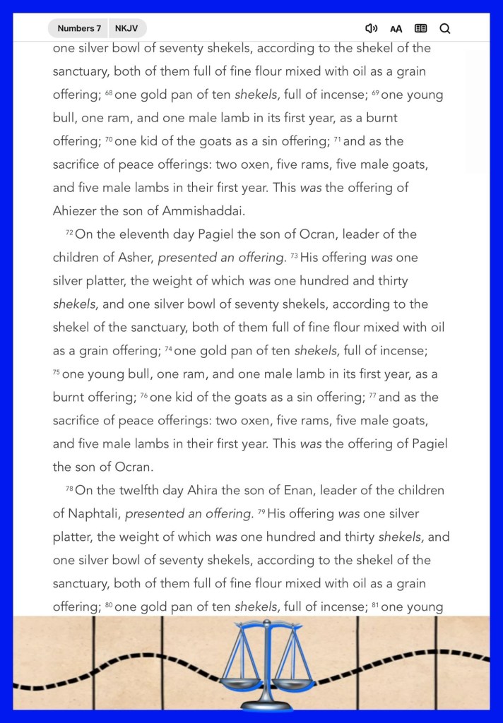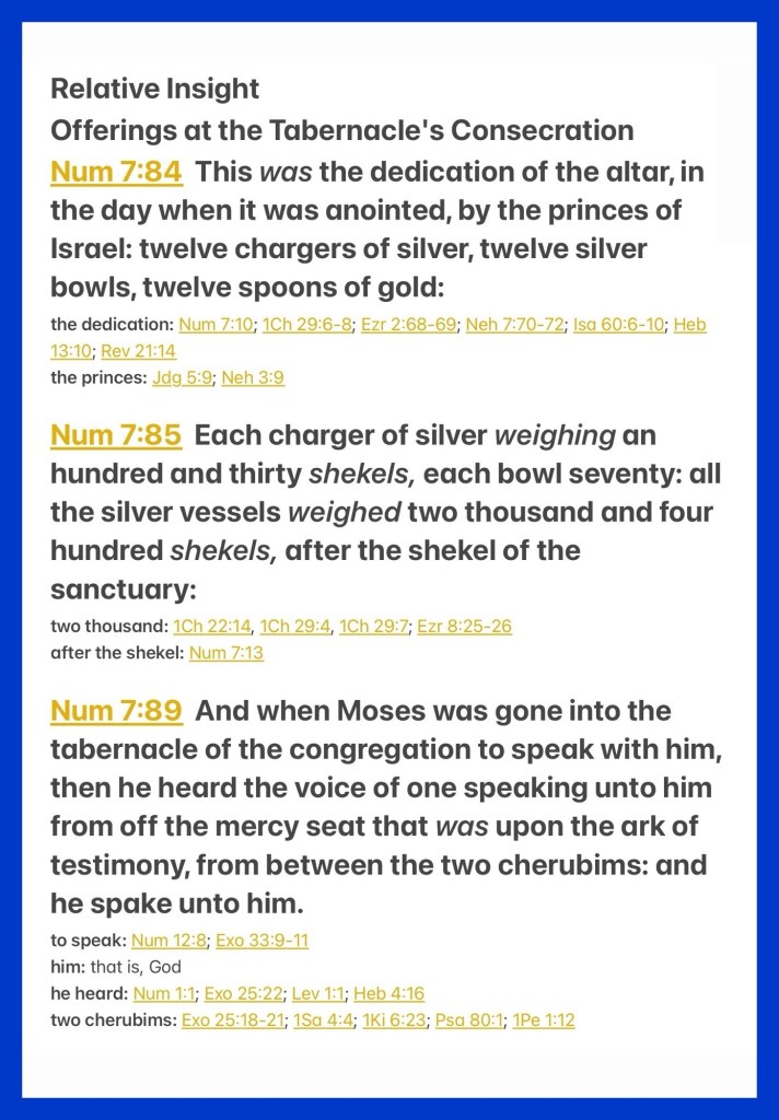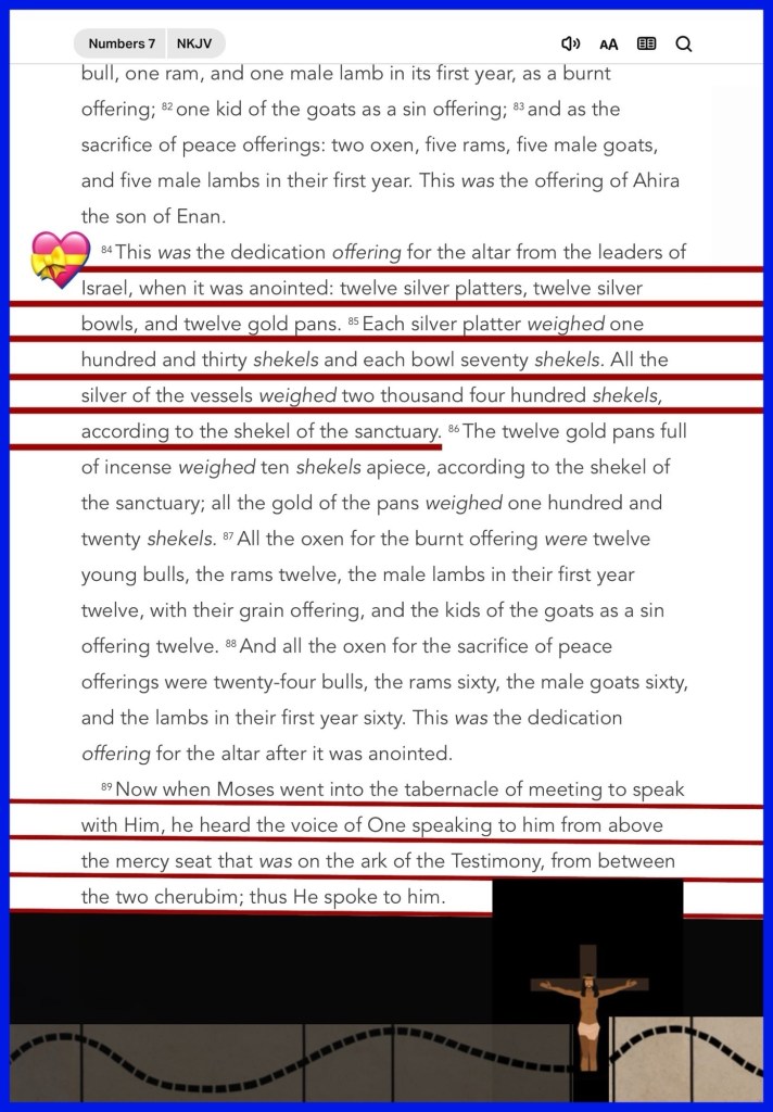 “This was the dedication offering for the altar from the leaders of Israel, when it was anointed: twelve silver platters, twelve silver bowls, and twelve gold pans. Each silver platter weighed one hundred and thirty shekels and each bowl seventy shekels. All the silver of the vessels weighed two thousand four hundred shekels, according to the shekel of the sanctuary. Now when Moses went into the tabernacle of meeting to speak with Him, he heard the voice of One speaking to him from above the mercy seat that was on the ark of the Testimony, from between the two cherubim; thus He spoke to him.” Numbers 7:84-85, 89