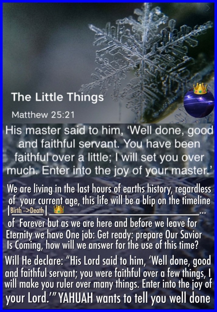 Greetings BeLoved I’m so very grateful for the gift of life (and that YAH saw fit to extend it one more day for each of us) HalleluYAH! Every precious hour, minute, second, moment is a glorious gift of opportunity, may we study YAH’S WORD paying close attention to the details spelled out with intention and all purpose AGAPÈ LOVE to the children of GOD Dedicated To Walk In THE WAY through the matrix of life unto Deliverance and into the Promise of Eternal Life until then let’s allow THE RUACH HA’QUODESH (HOLY SPIRIT) to have His way and ready us for travel. Have a wonderful day, remember you are loved beyond measure spend time in CHRIST’S WORD and see Him in every verse be lavished in His LOVE and Walk Good 💗