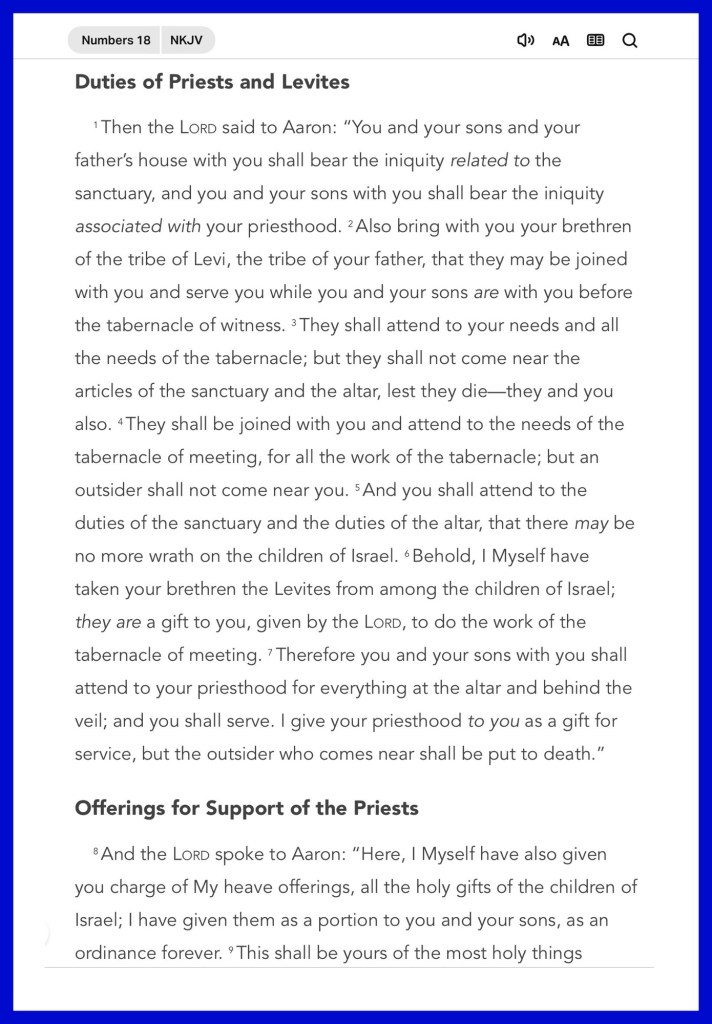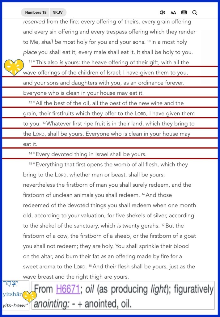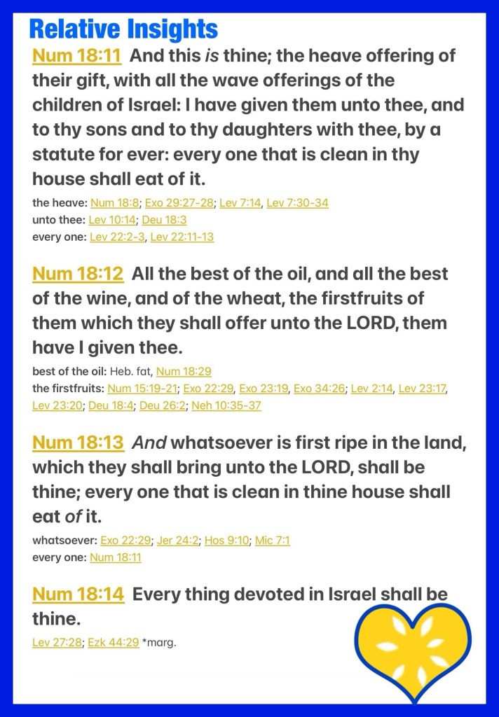 ““This also is yours: the heave offering of their gift, with all the wave offerings of the children of Israel; I have given them to you, and your sons and daughters with you, as an ordinance forever. Everyone who is clean in your house may eat it. “All the best of the oil, all the best of the new wine and the grain, their firstfruits which they offer to the Lord, I have given them to you. Whatever first ripe fruit is in their land, which they bring to the Lord, shall be yours. Everyone who is clean in your house may eat it. “Every devoted thing in Israel shall be yours.” Numbers 18:11-14