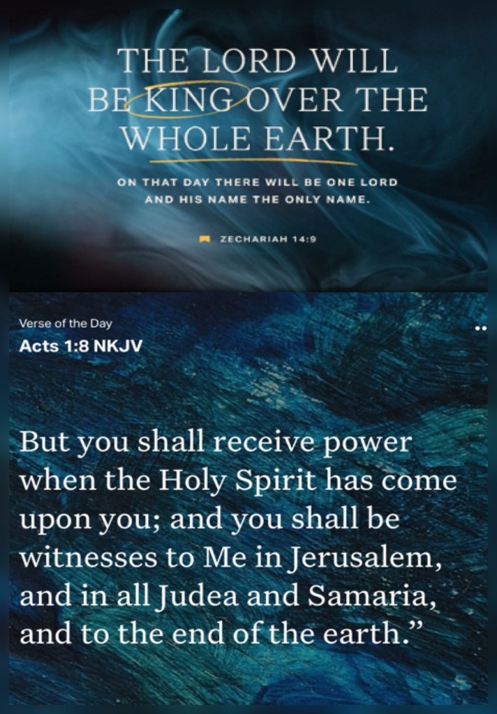 Today’s message Numbers 21, today’s verses: “And the Lord shall be King over all the earth. In that day it shall be— “The Lord is one,” And His name one.” Zechariah 14:9 “But you shall receive power when the Holy Spirit has come upon you; and you shall be witnesses to Me in Jerusalem, and in all Judea and Samaria, and to the end of the earth.”” Acts 1:8