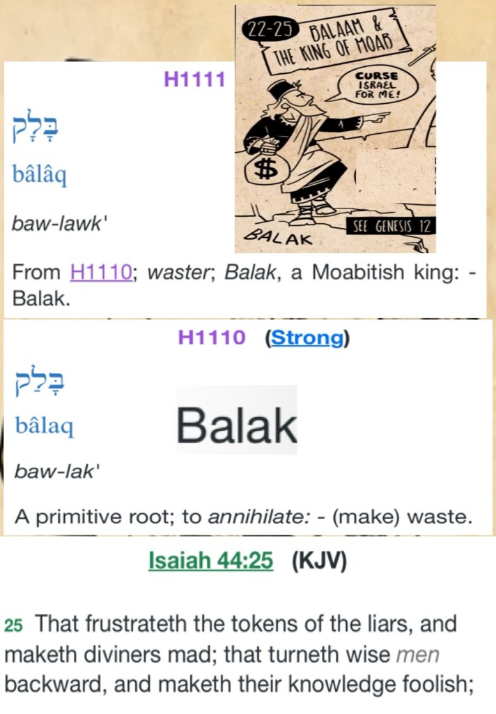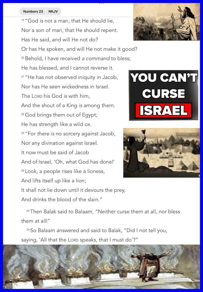 Greetings BeLoved child of THE MOST HIGH GOD YHWH: YAH: JAH. Numbers 23 is a pretty awesome study because it goes straight to the heart of what many professed Christian’s: children of GOD: students of THE WORD turn a blind eye or refuse to address or acknowledge as an actual (spiritual warfare) problem not just in the world but right there in the pews or our familial circles: witchcraft, rebellion, blatant sin. Does anyone else notice that Balak who contrary to his names meaning was operating in the spirit of fear, when he knowingly contracted a (ill will / murderous) hit on the children of GOD? He sent for one to “prophesy death or to annihilate ” this body of travelers; but Glory Be To EL SHADDAI (ALMIGHTY GOD)for His Mercies and Grace, could we be accidentally or intentionally walking contrary to THE WILL Or THE WORD Of GOD Proverbs 15:8 The sacrifice of the wicked is an abomination to the LORD: but the prayer of the upright is his delight. Exodus 20:24 An altar of earth thou shalt make unto me, and shalt sacrifice thereon thy burnt offerings, and thy peace offerings, thy sheep, and thine oxen: in all places where I record my name I will come unto thee, and I will bless thee. Proverbs 26:2 As the bird by wandering, as the swallow by flying, so the curse causeless shall not come. 🛡️ so the best course of action BeLoved Is To Walk In YAH’S LOVE WORD WAY 🙌 Always and Remember child of YAH: Who JAH Bless’ No Man Can Curse! Be Well, Walk Good.