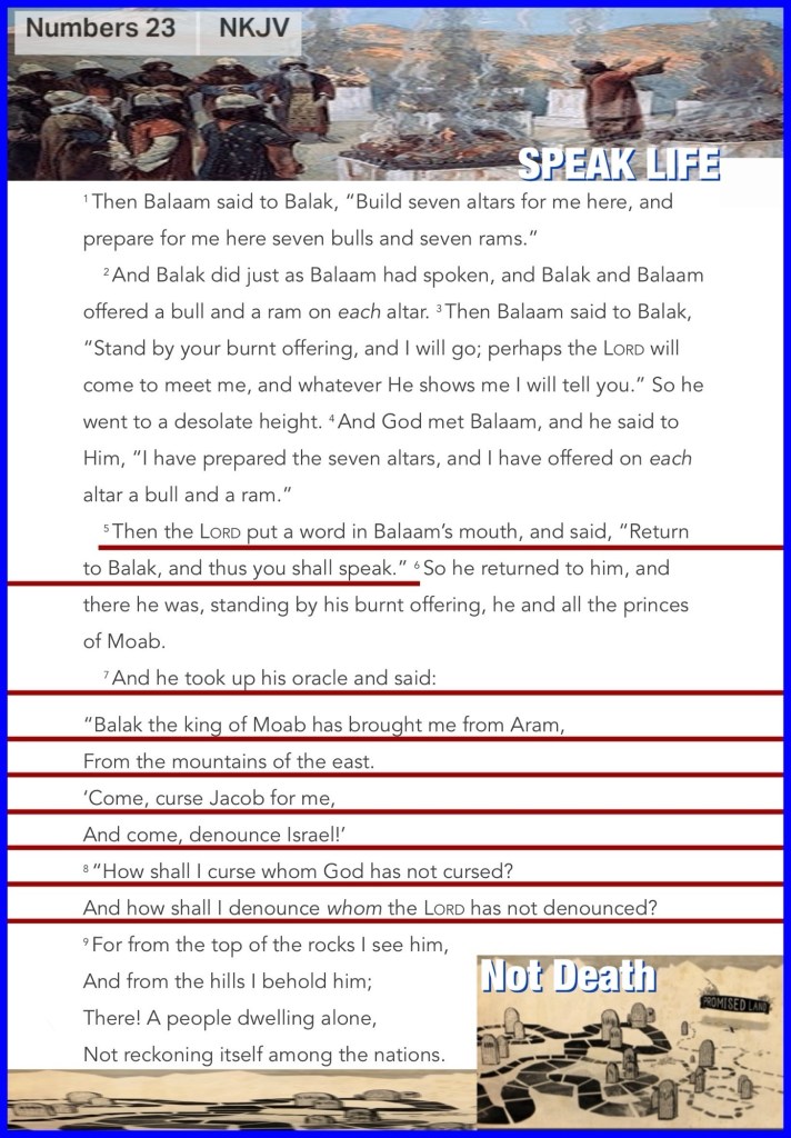 “Then the Lord put a word in Balaam’s mouth, and said, “Return to Balak, and thus you shall speak.” And he took up his oracle and said: “Balak the king of Moab has brought me from Aram, From the mountains of the east. ‘Come, curse Jacob for me, And come, denounce Israel!’ “How shall I curse whom God has not cursed? And how shall I denounce whom the Lord has not denounced?” Numbers 23:5, 7-8