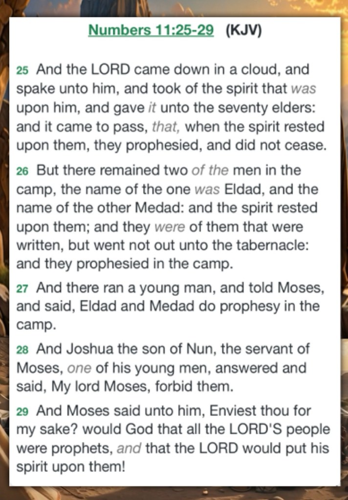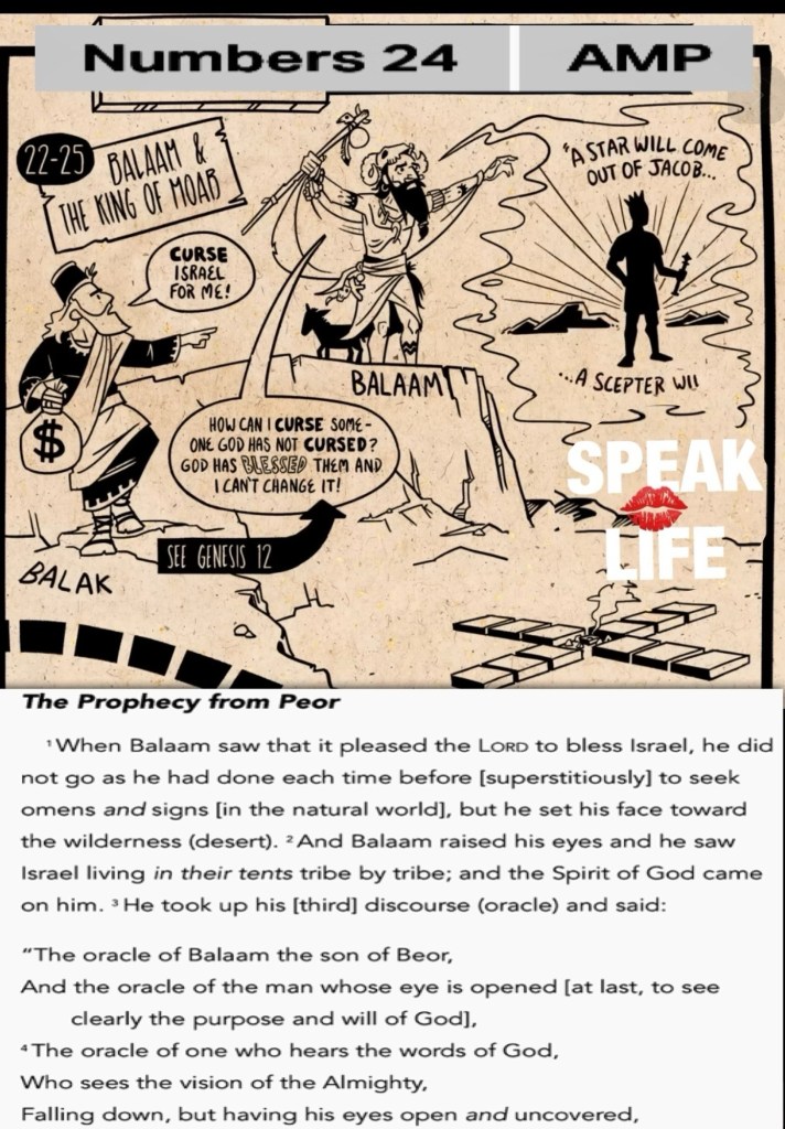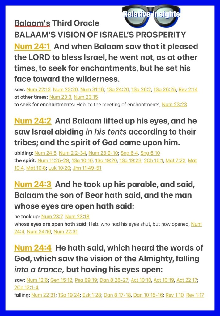 “Now when Balaam saw that it pleased the Lord to bless Israel, he did not go as at other times, to seek to use sorcery, but he set his face toward the wilderness. And Balaam raised his eyes, and saw Israel encamped according to their tribes; and the Spirit of God came upon him. Then he took up his oracle and said: “The utterance of Balaam the son of Beor, The utterance of the man whose eyes are opened, The utterance of him who hears the words of God, Who sees the vision of the Almighty, Who falls down, with eyes wide open:” Numbers 24:1-4