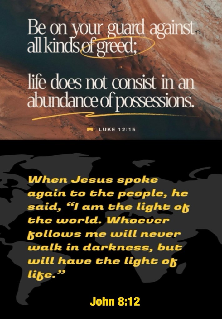 Today’s message Numbers 24, today’s verses: “And He said to them, “Take heed and beware of covetousness, for one’s life does not consist in the abundance of the things he possesses.”” Luke 12:15 “Then Jesus spoke to them again, saying, “I am the light of the world. He who follows Me shall not walk in darkness, but have the light of life.””John 8:12