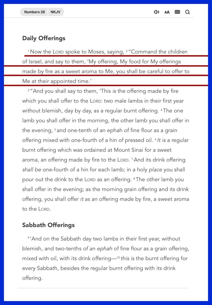 “Now the Lord spoke to Moses, saying, “Command the children of Israel, and say to them, ‘My offering, My food for My offerings made by fire as a sweet aroma to Me, you shall be careful to offer to Me at their appointed time.’ And on the seventh day you shall have a holy convocation. You shall do no customary work.” Numbers 28:1-2, 25