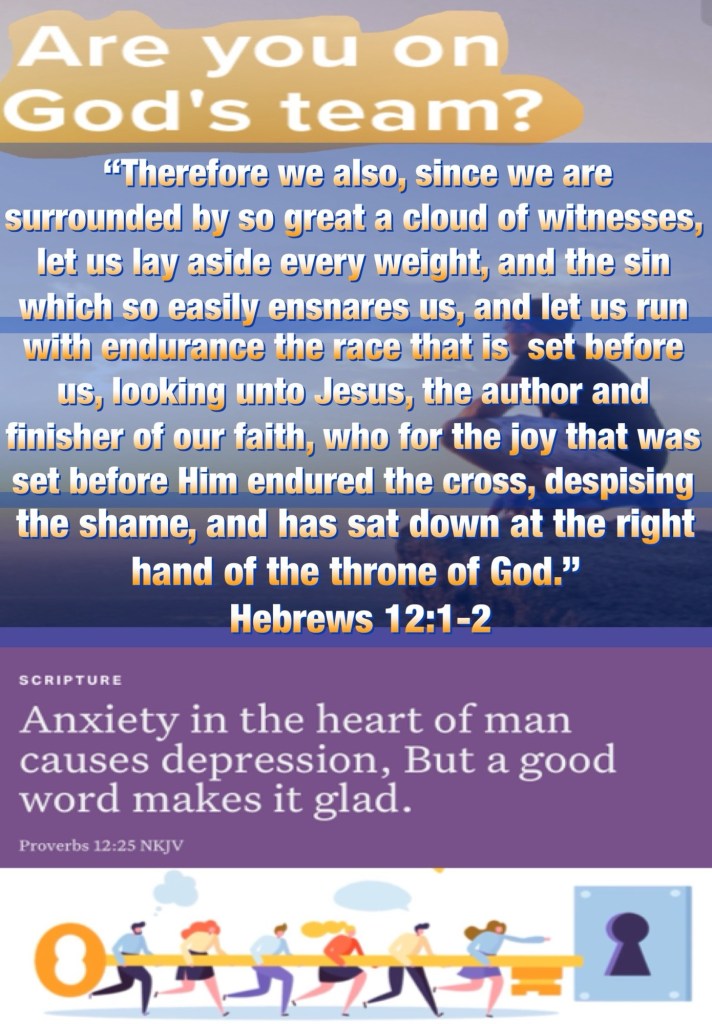 Today’s message Numbers 30, today’s verses: “Therefore we also, since we are surrounded by so great a cloud of witnesses, let us lay aside every weight, and the sin which so easily ensnares us, and let us run with endurance the race that is set before us, looking unto Jesus, the author and finisher of our faith, who for the joy that was set before Him endured the cross, despising the shame, and has sat down at the right hand of the throne of God.” Hebrews 12:1-2 “Anxiety in the heart of man causes depression, But a good word makes it glad.” Proverbs 12:25