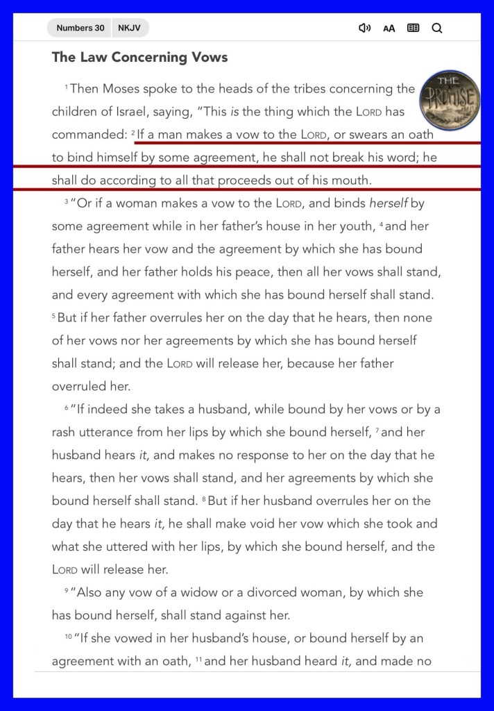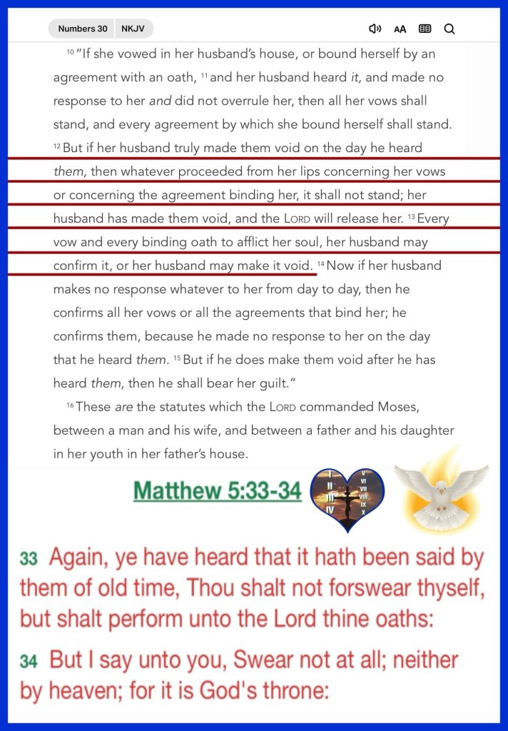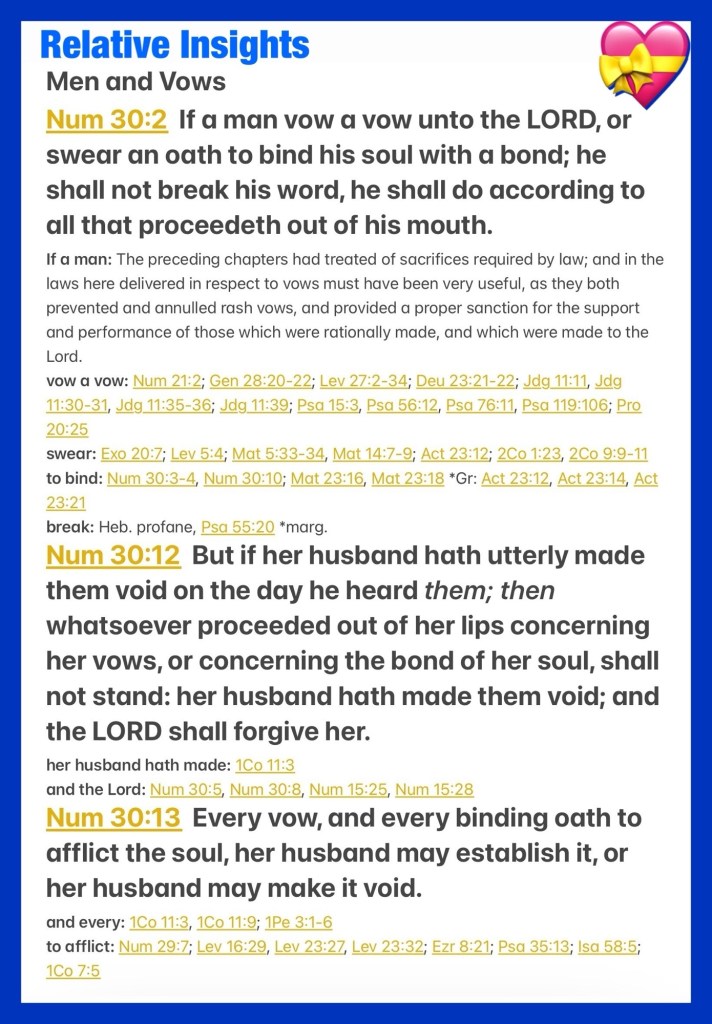“If a man makes a vow to the Lord, or swears an oath to bind himself by some agreement, he shall not break his word; he shall do according to all that proceeds out of his mouth. But if her husband truly made them void on the day he heard them, then whatever proceeded from her lips concerning her vows or concerning the agreement binding her, it shall not stand; her husband has made them void, and the Lord will release her. Every vow and every binding oath to afflict her soul, her husband may confirm it, or her husband may make it void.” Numbers 30:2, 12-13