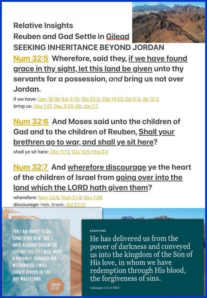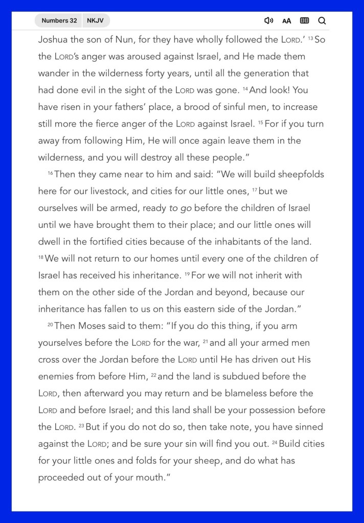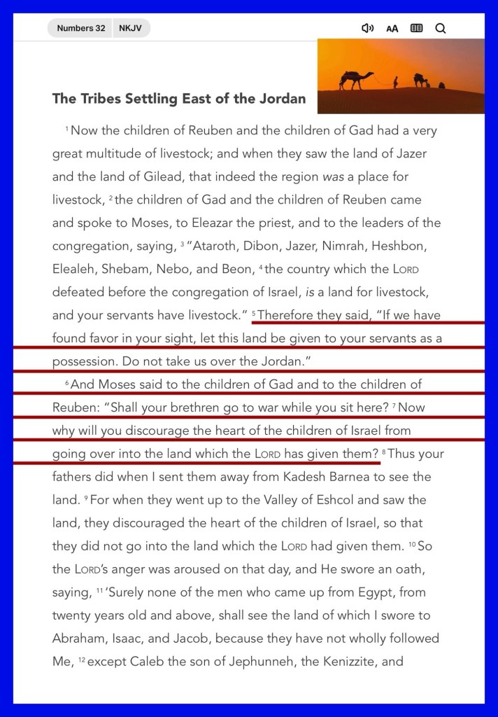 “Therefore they said, “If we have found favor in your sight, let this land be given to your servants as a possession. Do not take us over the Jordan.” And Moses said to the children of Gad and to the children of Reuben: “Shall your brethren go to war while you sit here? Now why will you discourage the heart of the children of Israel from going over into the land which the Lord has given them?” Numbers 32:5-7