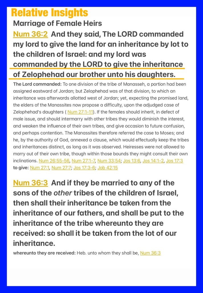 “And they said: “The Lord commanded my Lord Moses to give the land as an inheritance by lot to the children of Israel, and my Lord was commanded by the Lord to give the inheritance of our brother Zelophehad to his daughters. Now if they are married to any of the sons of the other tribes of the children of Israel, then their inheritance will be taken from the inheritance of our fathers, and it will be added to the inheritance of the tribe into which they marry; so it will be taken from the lot of our inheritance.” Numbers 36:2-3