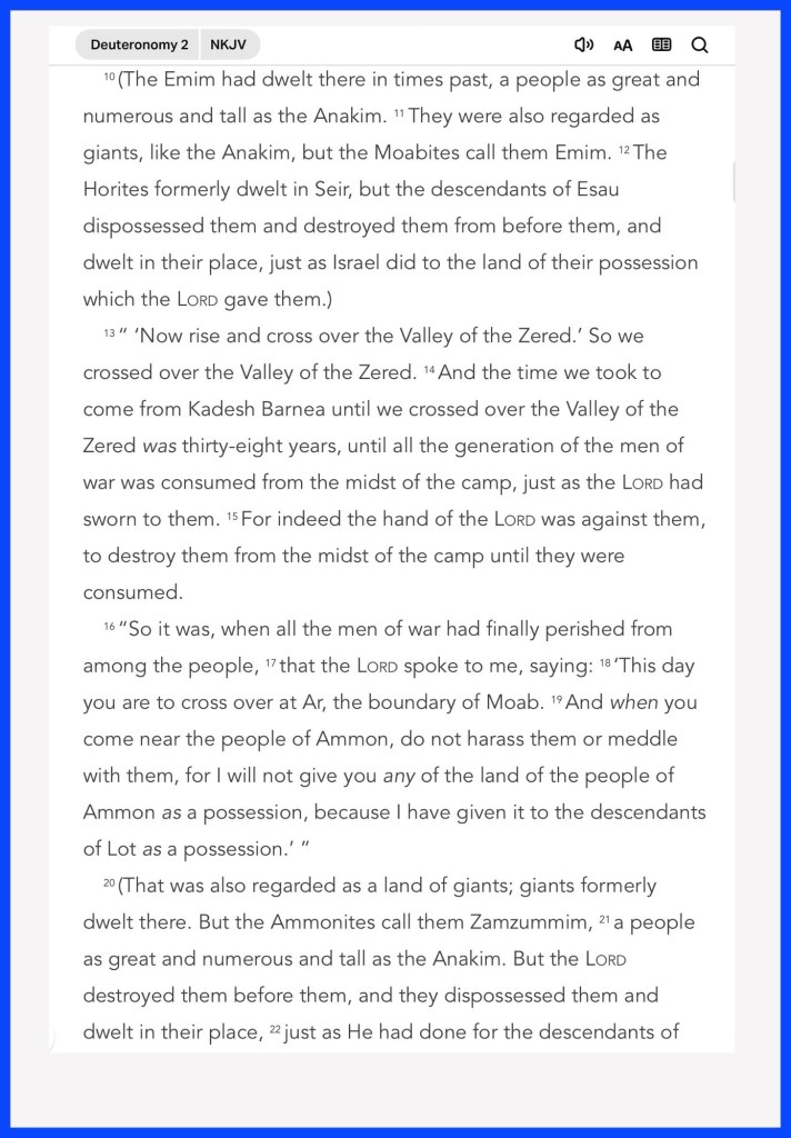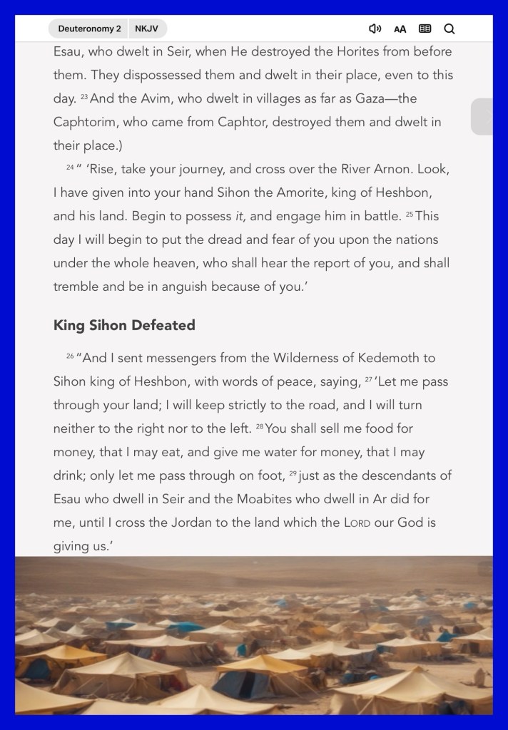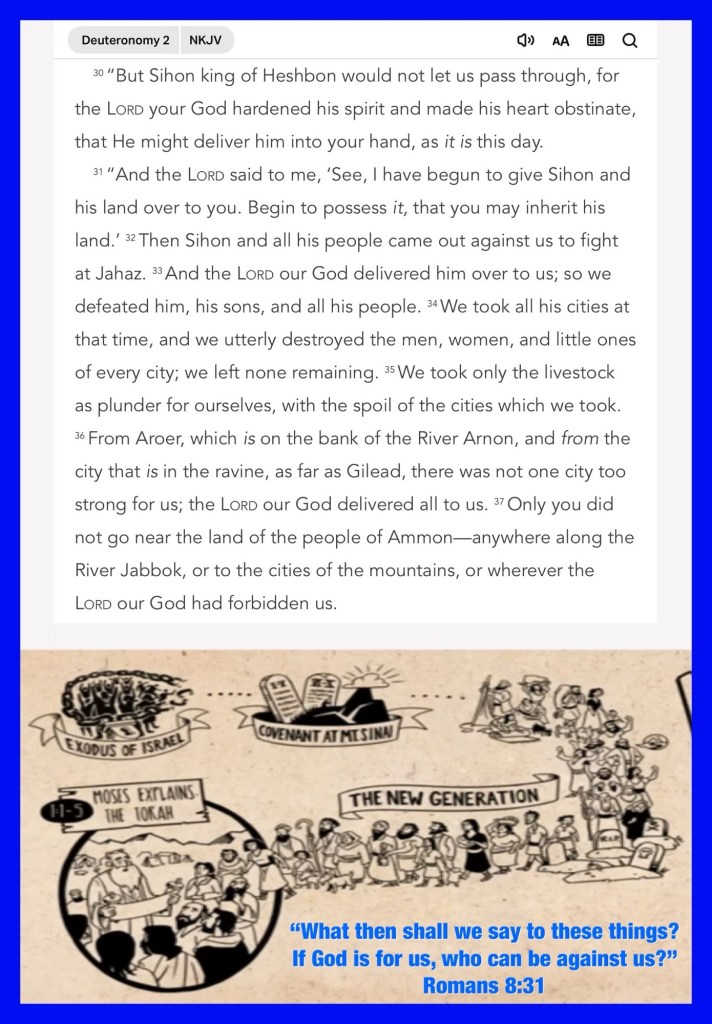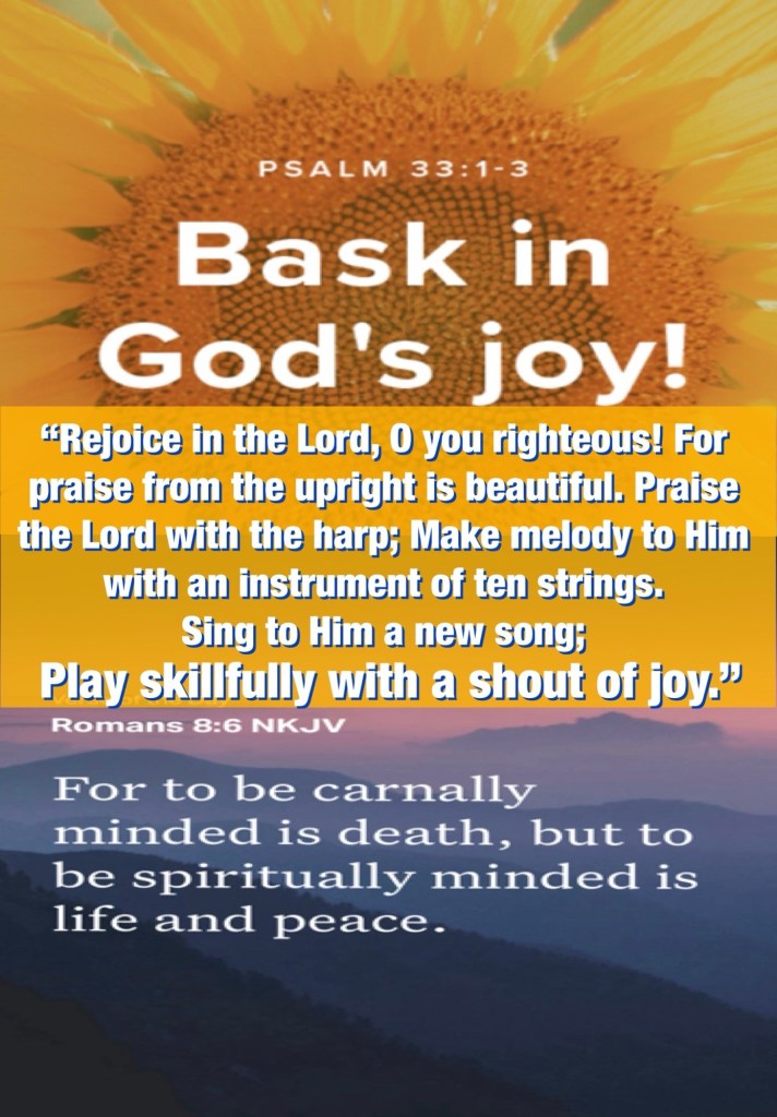 Today’s lesson Deuteronomy 2, verses of the day: “Rejoice in the Lord, O you righteous! For praise from the upright is beautiful. Praise the Lord with the harp; Make melody to Him with an instrument of ten strings. Sing to Him a new song; Play skillfully with a shout of joy.” Psalms 33:1-3 “For to be carnally minded is death, but to be spiritually minded is life and peace.” Romans 8:6