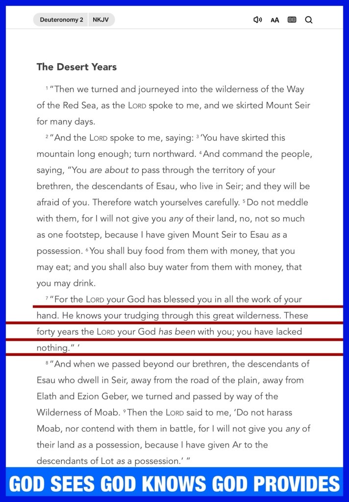 ““For the Lord your God has blessed you in all the work of your hand. He knows your trudging through this great wilderness. These forty years the Lord your God has been with you; you have lacked nothing.” ’” Deuteronomy 2:7