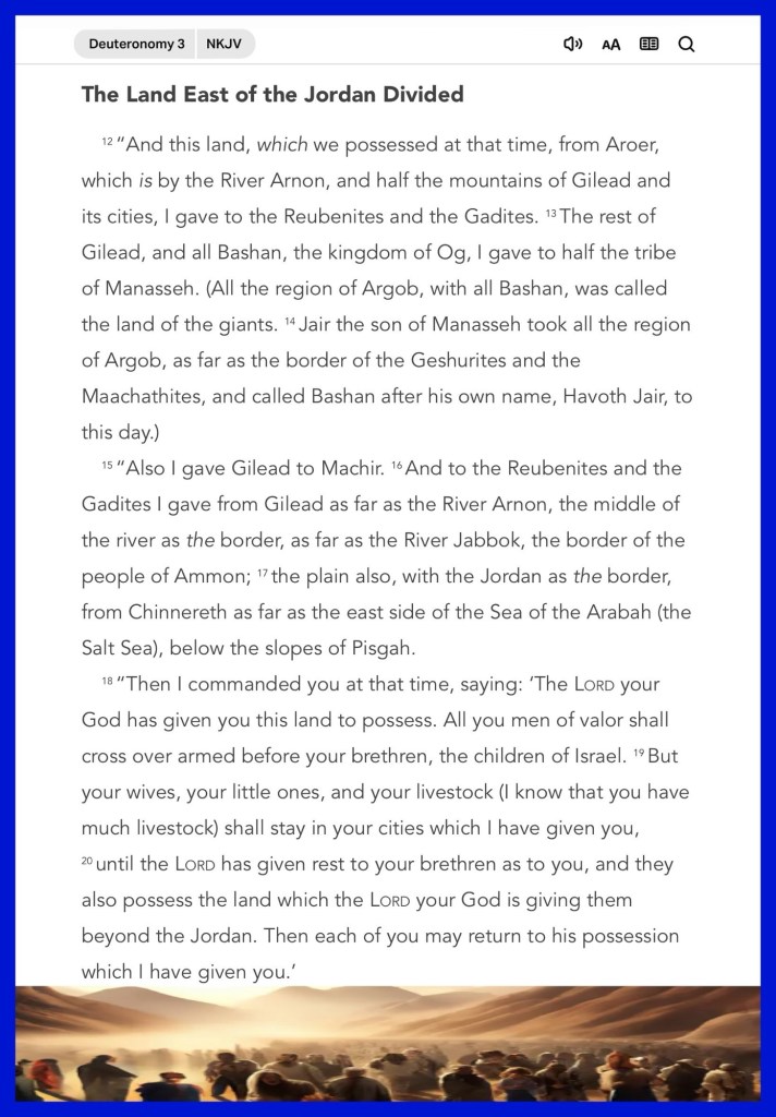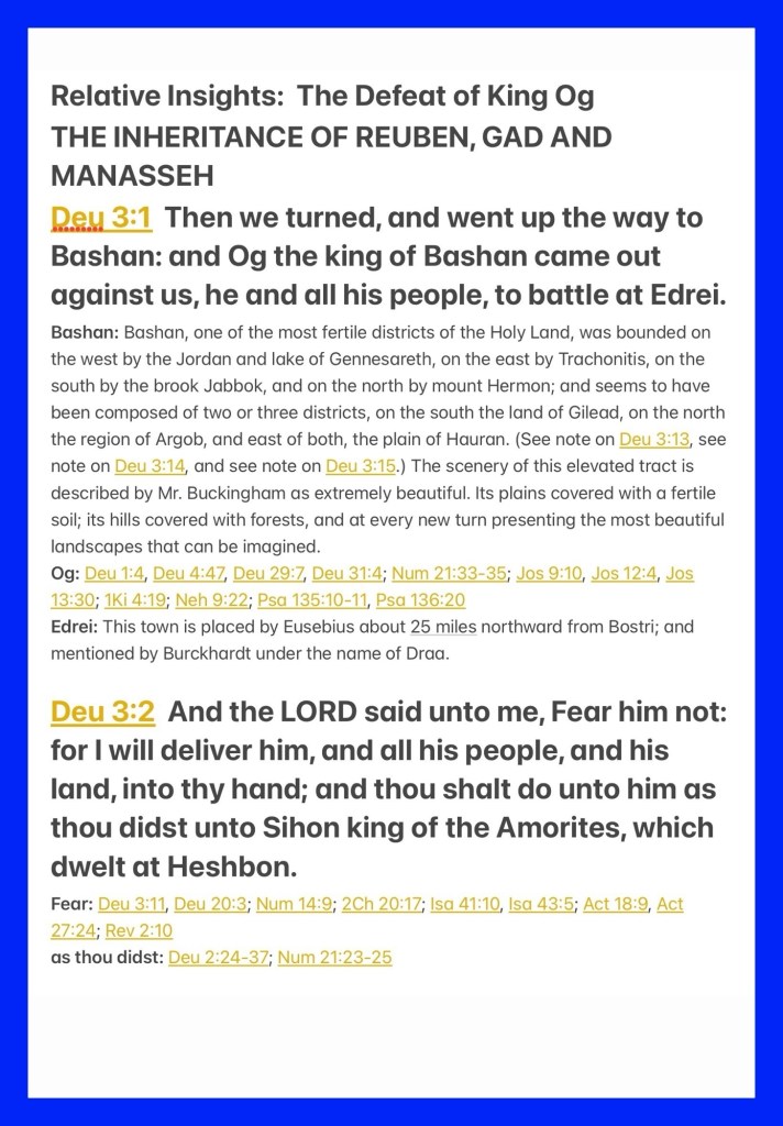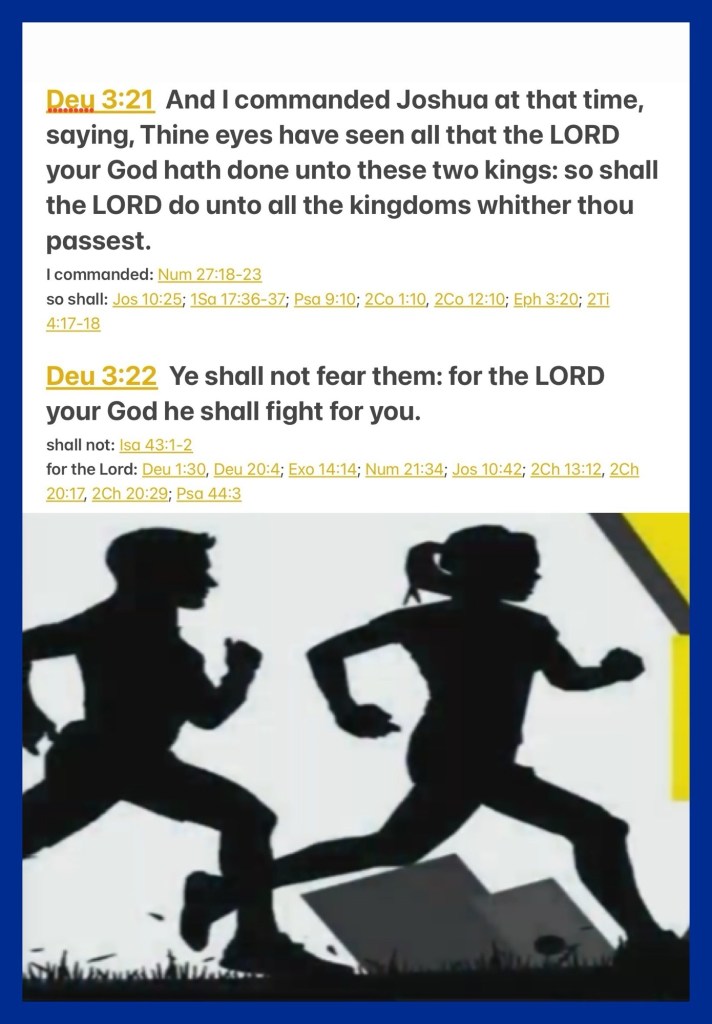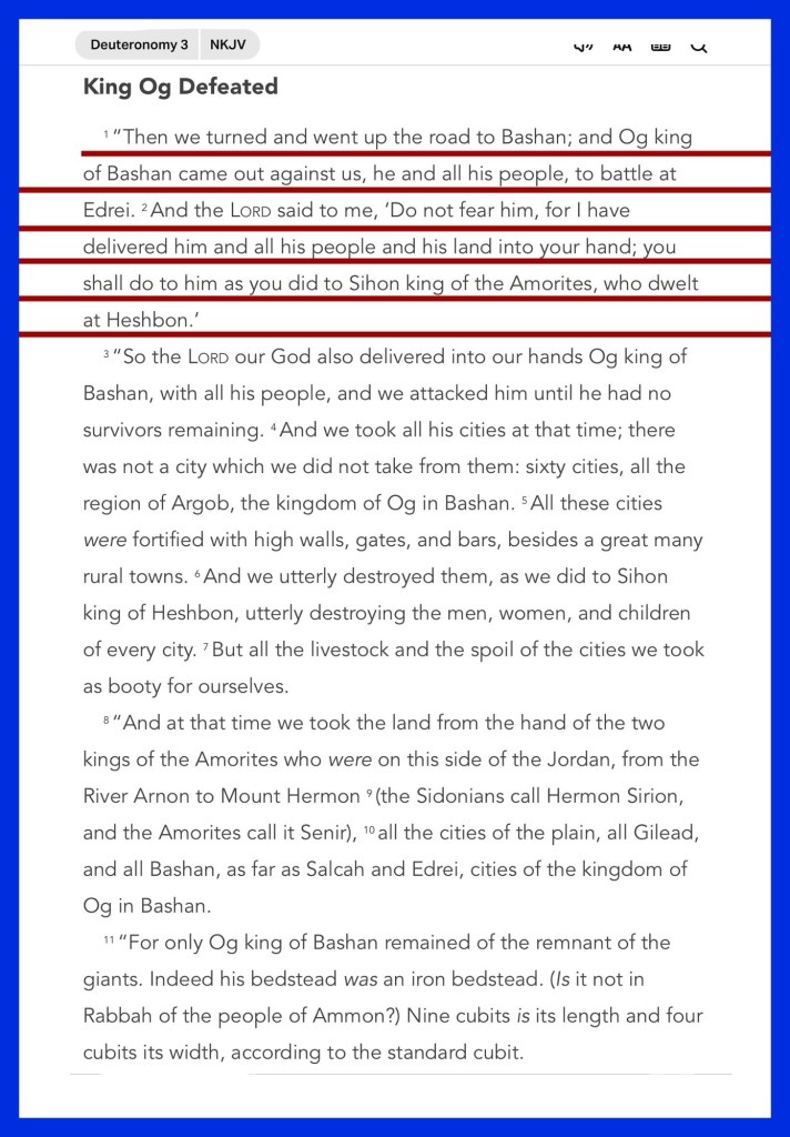 ““Then we turned and went up the road to Bashan; and Og king of Bashan came out against us, he and all his people, to battle at Edrei. And the Lord said to me, ‘Do not fear him, for I have delivered him and all his people and his land into your hand; you shall do to him as you did to Sihon king of the Amorites, who dwelt at Heshbon.’ ….“And I commanded Joshua at that time, saying, ‘Your eyes have seen all that the Lord your God has done to these two kings; so will the Lord do to all the kingdoms through which you pass. You must not fear them, for the Lord your God Himself fights for you.’” Deuteronomy 3:1-2, 21-22