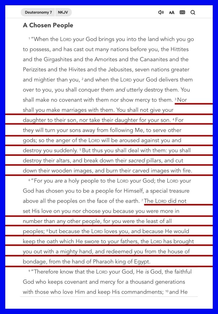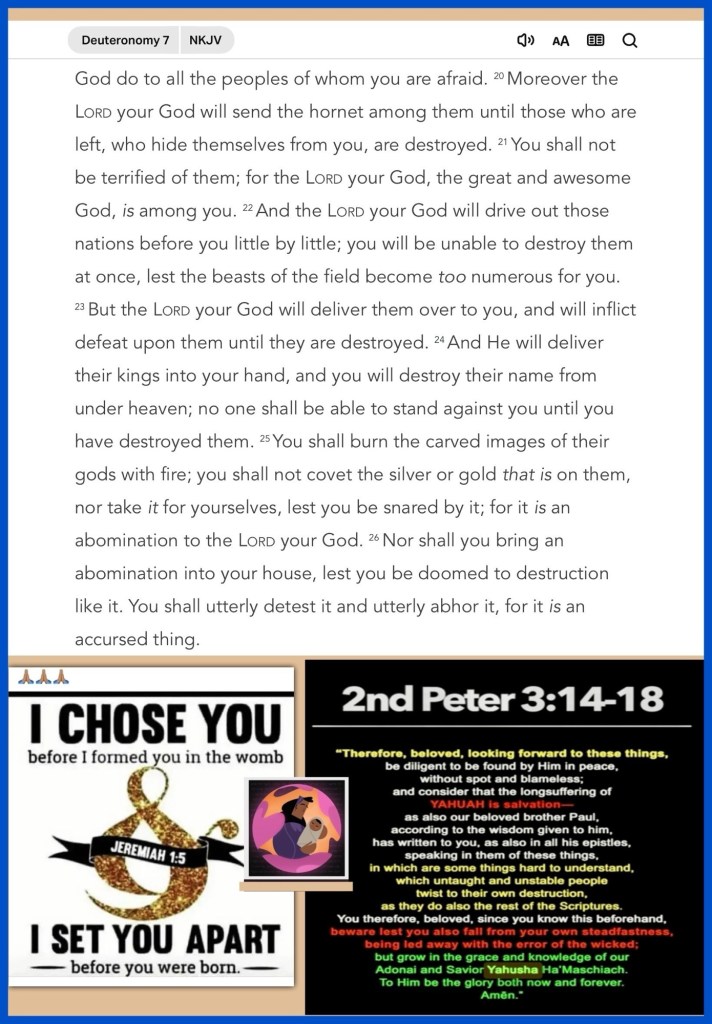 Blessed new week my brothers and sisters, please study the verses in today’s lesson and I pray YAH makes it plain and applicable, we’re given clear guidance, warnings about “yoking ourselves” to unfavorable people (practices, situations, circumstances) “For they will turn your sons away from following Me, to serve other gods; so the anger of the Lord will be aroused against you and destroy you suddenly. But thus you shall deal with them: you shall destroy their altars, and break down their sacred pillars, and cut down their wooden images, and burn their carved images with fire.” Deuteronomy 7:4-5 We the “church (bride)” are regarded with such Love as expressed In The Vows of Love The Ten Commandments A Code Of Conduct That Bears In It The Seal Of ALMIGHTY GOD And Like A Will was Ratified In CHRIST Blood 🩸 The Assurance Of Salvation for All who will Heed THE WORD Of YHWH Repent and Find True Rest (Through THE RUACH HA’QUODESH: THE HOLY SPIRIT) CHRIST In you our Hope and Glory, everything we need for success Is Written Prayerfully take up your Bible, Read and Do according to YAH’S Leading GOD Bless You BeLoved.