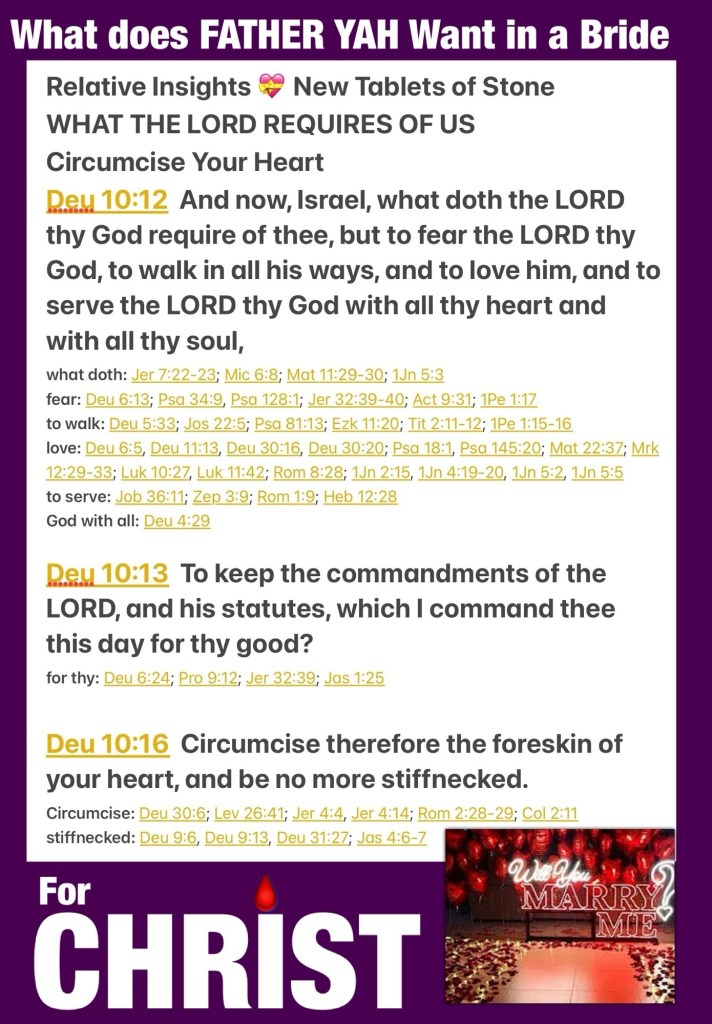 Greetings BeLoved Who Wants A Half Hearted Love? Even for free I think we all can agree the answer is Nobody! So why then do we think it’s okay to offer up a serving of lukewarm, non-committed, halfhearted “love” to THE SAVIOR YAH and call it worship, seriously we know He’s our FATHER yet we don’t say His Name, we know He’s our Teacher: Protector: Provider: Guide yet we’re unsure about His Advice and won’t Really Read To Know THE WORD; Psalms 128:1 A Song of degrees. Blessed is every one that feareth the LORD; that walketh in his ways. The Bible Is A LOVE Story, The Commandments Are His Vows a literal How to Love 💗 Honor Respect GOD and Man Guide which reminds me dear Israel: Bride: Church this all boils down to accepting one of two proposals, CHRIST (LOVE LIFE ETERNAL) or the AntiChrist (counterfeit god, sin: seducer: momentary pleasure: wickedness —> death). I pray that you see value in Experiencing Life Through The Salvational Agapè LOVE CHRIST Offers to us Intentionally now and for eternity Heaven Opened Up and Gave us Its Best Wholeheartedly; you don’t have to wonder when The Scriptures Proclaim please Hear and Believe you are loved beyond measure and it’s clear what our CREATOR GOD wants from you “If you Love ME Keep MY Commandments.” John 14:15