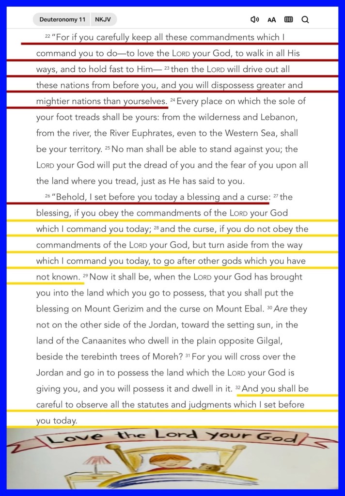 ““For if you carefully keep all these commandments which I command you to do—to love the Lord your God, to walk in all His ways, and to hold fast to Him— then the Lord will drive out all these nations from before you, and you will dispossess greater and mightier nations than yourselves. “Behold, I set before you today a blessing and a curse:” Deuteronomy 11:22-23, 26