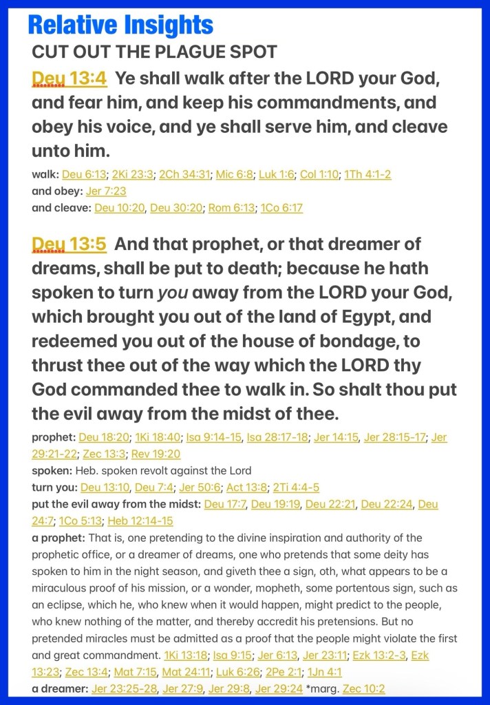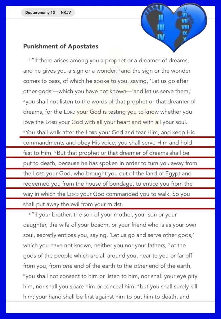 “You shall walk after the Lord your God and fear Him, and keep His commandments and obey His voice; you shall serve Him and hold fast to Him. But that prophet or that dreamer of dreams shall be put to death, because he has spoken in order to turn you away from the Lord your God, who brought you out of the land of Egypt and redeemed you from the house of bondage, to entice you from the way in which the Lord your God commanded you to walk. So you shall put away the evil from your midst.” Deuteronomy 13:4-5