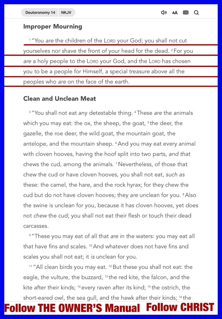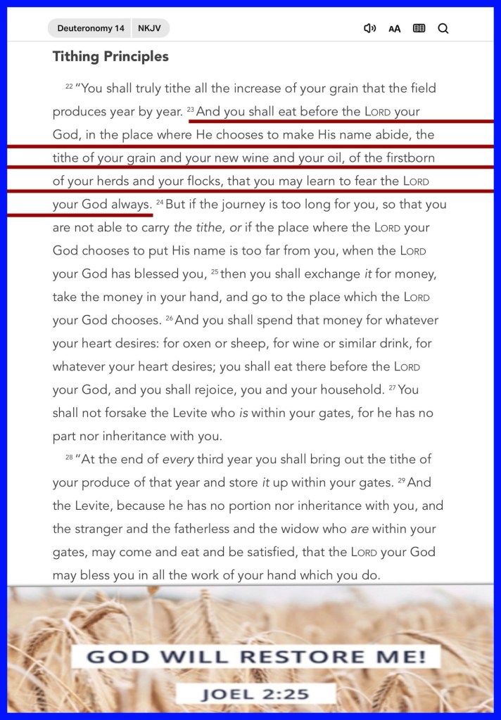 ““You are the children of the Lord your God; you shall not cut yourselves nor shave the front of your head for the dead. For you are a holy people to the Lord your God, and the Lord has chosen you to be a people for Himself, a special treasure above all the peoples who are on the face of the earth. And you shall eat before the Lord your God, in the place where He chooses to make His name abide, the tithe of your grain and your new wine and your oil, of the firstborn of your herds and your flocks, that you may learn to fear the Lord your God always.” Deuteronomy 14:1-2, 23