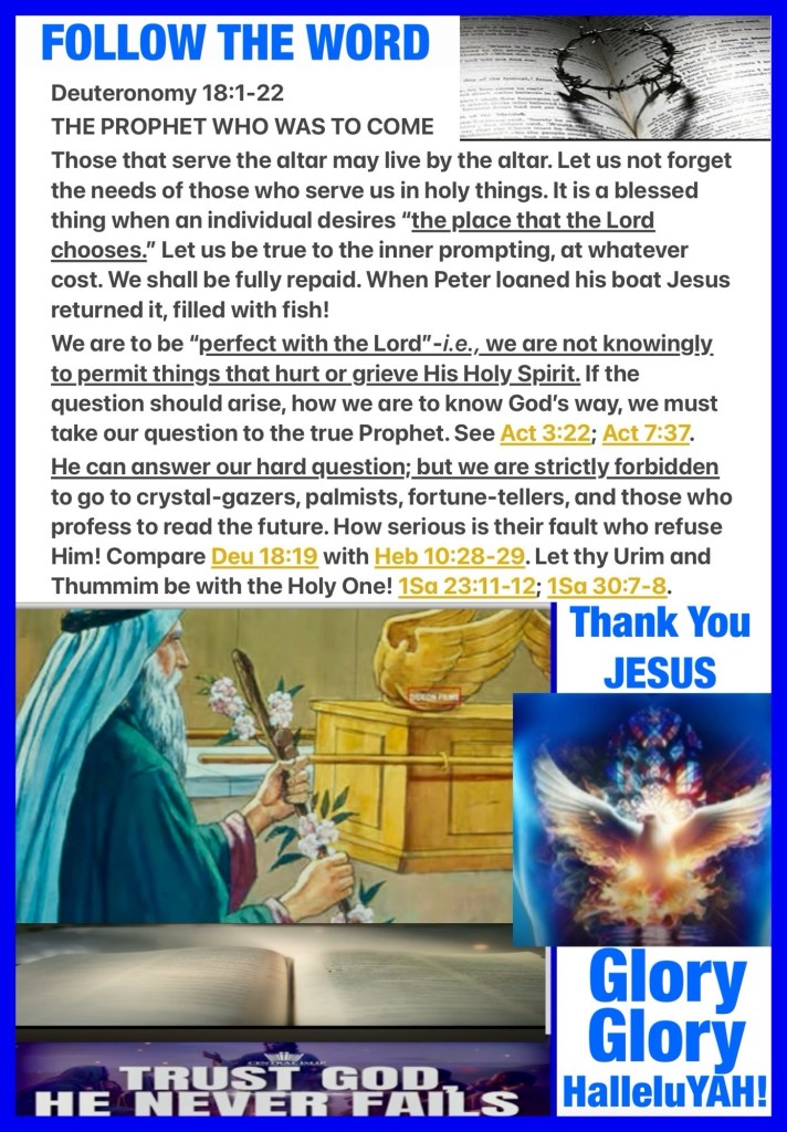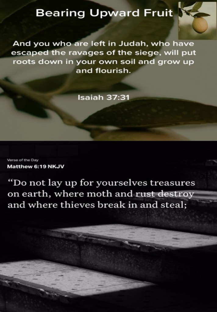 Today’s lesson Deuteronomy 18, today’s verses: “And the remnant who have escaped of the house of Judah Shall again take root downward, And bear fruit upward.” Isaiah 37:31 ““Do not lay up for yourselves treasures on earth, where moth and rust destroy and where thieves break in and steal;” Matthew 6:19