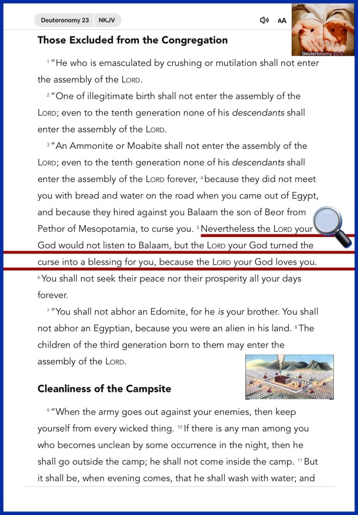 “Nevertheless the Lord your God would not listen to Balaam, but the Lord your God turned the curse into a blessing for you, because the Lord your God loves you. For the Lord your God walks in the midst of your camp, to deliver you and give your enemies over to you; therefore your camp shall be holy, that He may see no unclean thing among you, and turn away from you. That which has gone from your lips you shall keep and perform, for you voluntarily vowed to the Lord your God what you have promised with your mouth.” Deuteronomy 23:5, 14, 23