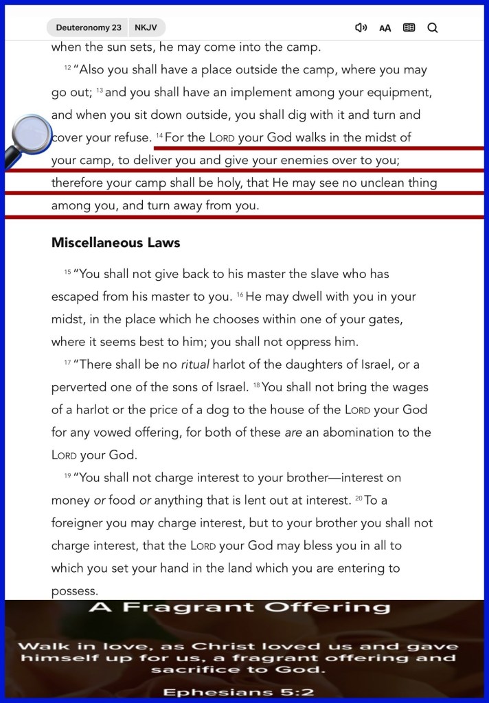 Why Walk In LOVE? Because LOVE Walked, Stood And Was Sacrificed for you; to Redeem you. Greetings BeLoved this is a day that THE LORD YAH Has Made, He woke us up and has allowed us the gift of His breath HalleluYAH! Thank GOD for every blessing spiritual, physical: temporal: healing, traveling mercies, deliverance from sin: idolatry {its side effects] and so much more! GOD IS GOOD! He Is Worthy To Be Praised! Thank you for strolling through The Scriptures with our Heavenly FATHER and myself, going Book by Book to learn more about JESUS: YAHUSHA: YHWH: CHRIST: THE WORD Made Flesh to Be The Greatest Object Lesson, our TRUE FORERUNNER: THE WILL, THE TRUTH, THE WAY, THE LIFE Of GOD our Role Model!and Greatest Example of LOVE With Intention so as to Glorify YAH THE FATHER. CHRIST’S Mission is our Mission let’s examine the life sketches through The Law 🔎 in Deut 23 🔍 note the applications for our lives today. GOD BLESS You: Stay Dressed In His Armor: Live In YAH’S LOVE, Walk Good ❣️