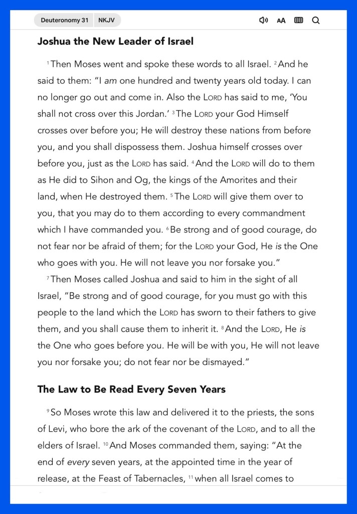 Today’s lesson Deuteronomy 31, today’s verses: “Blessed be the Lord, Who daily loads us with benefits, The God of our salvation! Selah” Psalms 68:19 “Then He said to them all, “If anyone desires to come after Me, let him deny himself, and take up his cross daily, and follow Me. For whoever desires to save his life will lose it, but whoever loses his life for My sake will save it.” Luke 9:23-24