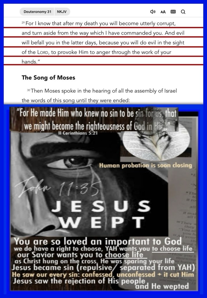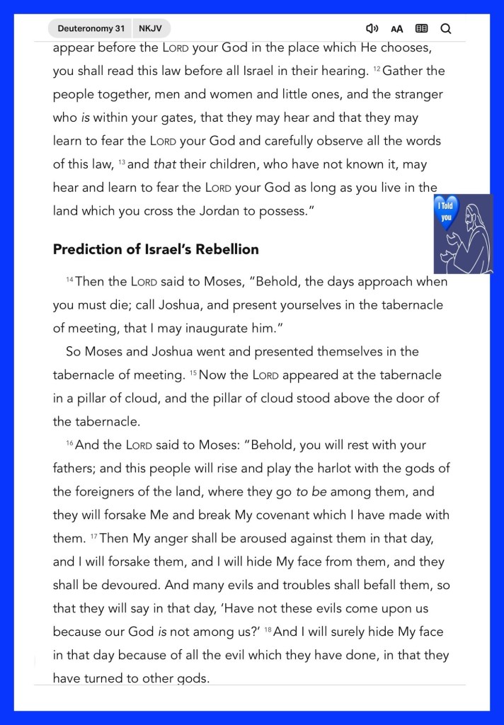 Greetings BeLoved child of YAH THE MOST HIGH GOD, our CREATOR: DELIVERER: FORERUNNER: THE ONLY WORTHY SACRIFICE: our SALVATION from sin and its consequences; Oh Yes SALVATION Is The Cure For Heart Break and Corruption! As you can see FATHER YAH Is well aware of our mess, tests and just how many ways we would fall, fail or simply forsake Him and His WORD, He Is Not shocked, nor shook by our blatant disregard, disrespect or ignorance and so He Lovingly Warns, He Speaks to our hearts and sometimes He allows us to walk in the filth of our corruption: idolatry: unfaithfulness so that we can contrast The Good and the evil that we know to come to a knowledge of The Truth and The Difference Found Only In our HOLY GOD. Today I pray that we Be Intentional In Loving GOD and Stop Breaking His Heart by Violating His LAWS OF LOVE (The 10 Commandments) The Filter Through which we examine The Bible in general; specifically the books of Deuteronomy. Thank you for sharing in this study, it’s time we get ready and get others ready our SALVATION our SOLUTION JESUS CHRIST (YAHUSHA HA’MASSIACH) Is Soon Coming Maranatha BeLoved, have a wonderful rest of your day Walk Good!😘🤗