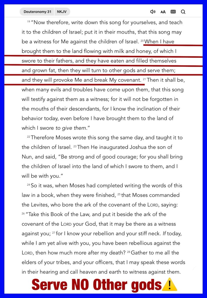 “When I have brought them to the land flowing with milk and honey, of which I swore to their fathers, and they have eaten and filled themselves and grown fat, then they will turn to other gods and serve them; and they will provoke Me and break My covenant. … For I know that after my death you will become utterly corrupt, and turn aside from the way which I have commanded you. And evil will befall you in the latter days, because you will do evil in the sight of the Lord, to provoke Him to anger through the work of your hands.”” Deuteronomy 31:20, 29