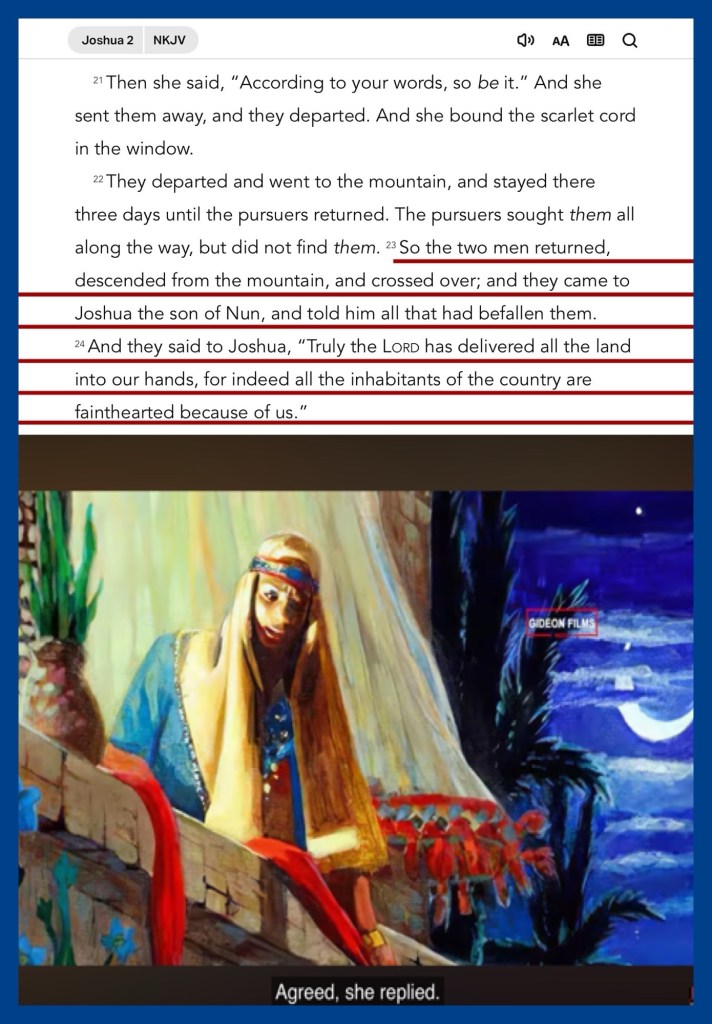 “So the two men returned, descended from the mountain, and crossed over; and they came to Joshua the son of Nun, and told him all that had befallen them. And they said to Joshua, “Truly the Lord has delivered all the land into our hands, for indeed all the inhabitants of the country are fainthearted because of us.”” Joshua 2:23-24