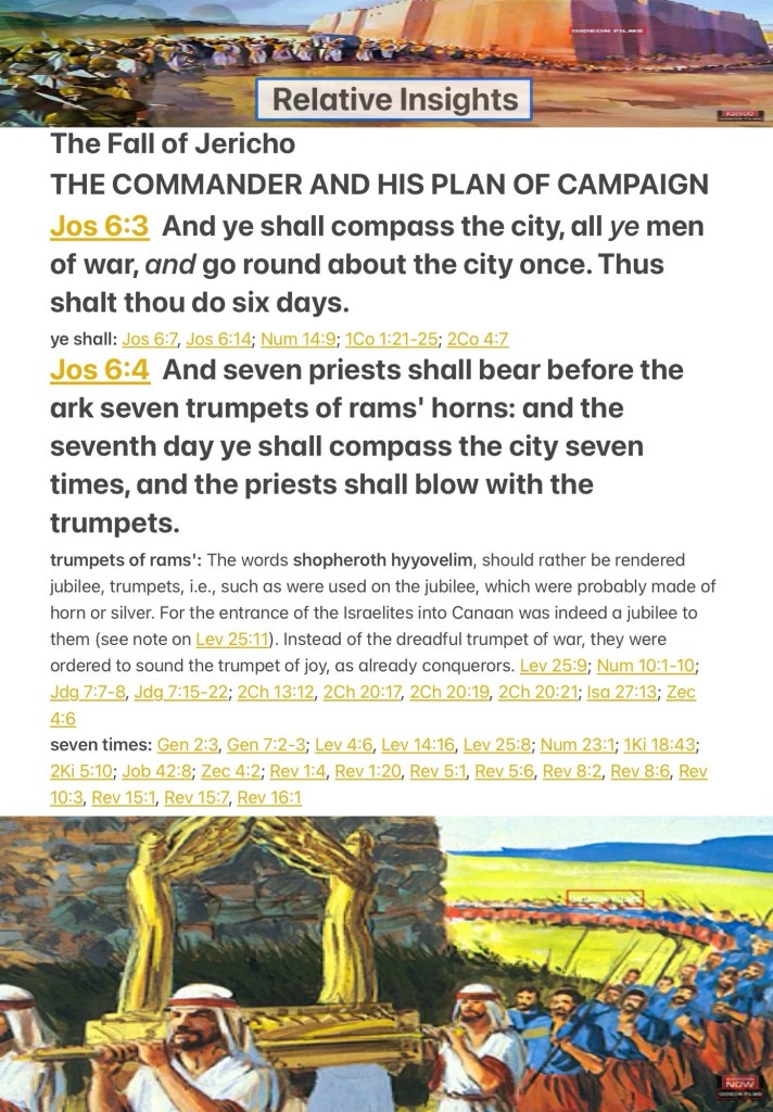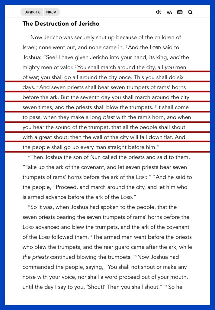 “You shall march around the city, all you men of war; you shall go all around the city once. This you shall do six days. And seven priests shall bear seven trumpets of rams’ horns before the ark. But the seventh day you shall march around the city seven times, and the priests shall blow the trumpets. It shall come to pass, when they make a long blast with the ram’s horn, and when you hear the sound of the trumpet, that all the people shall shout with a great shout; then the wall of the city will fall down flat. And the people shall go up every man straight before him.”” Joshua 6:3-5